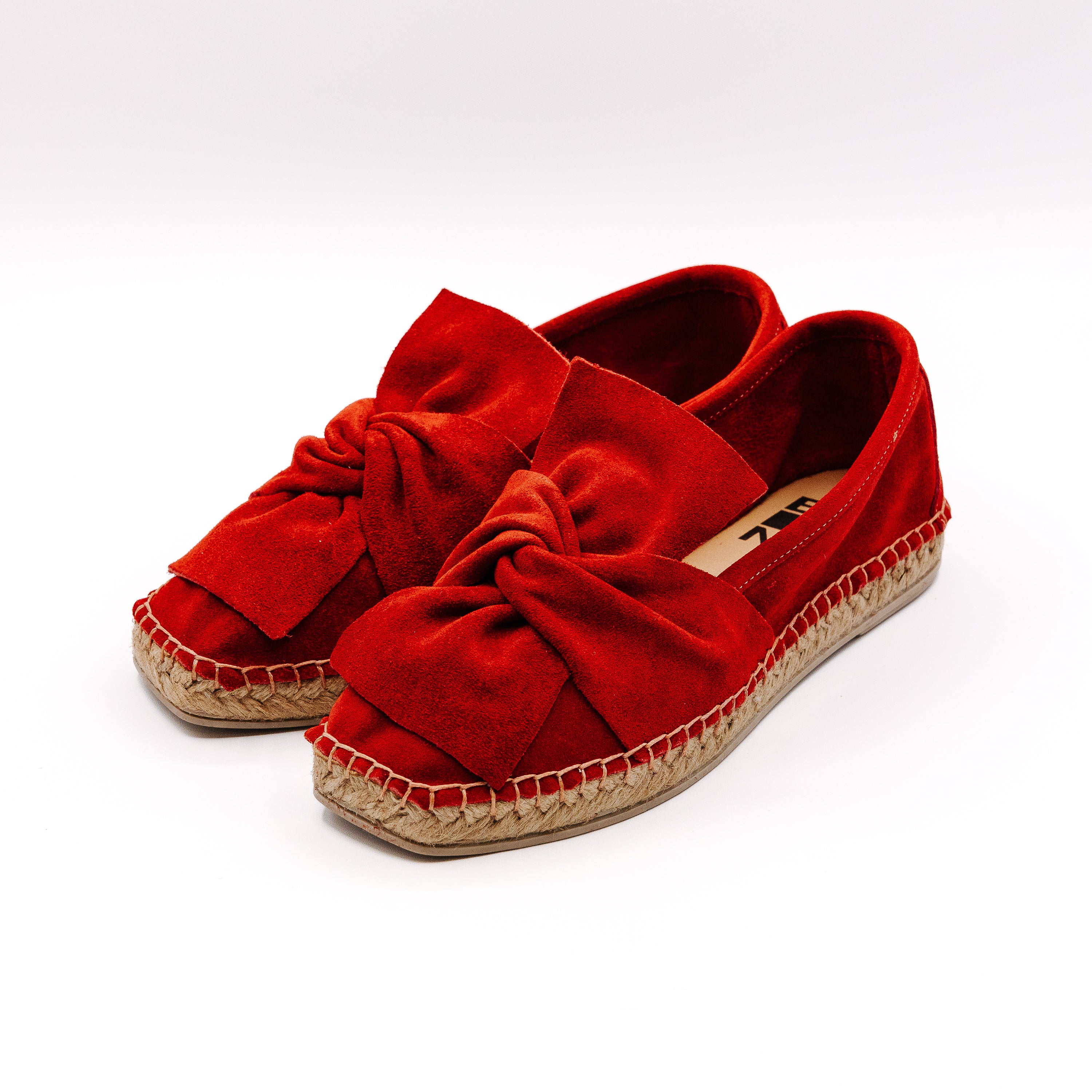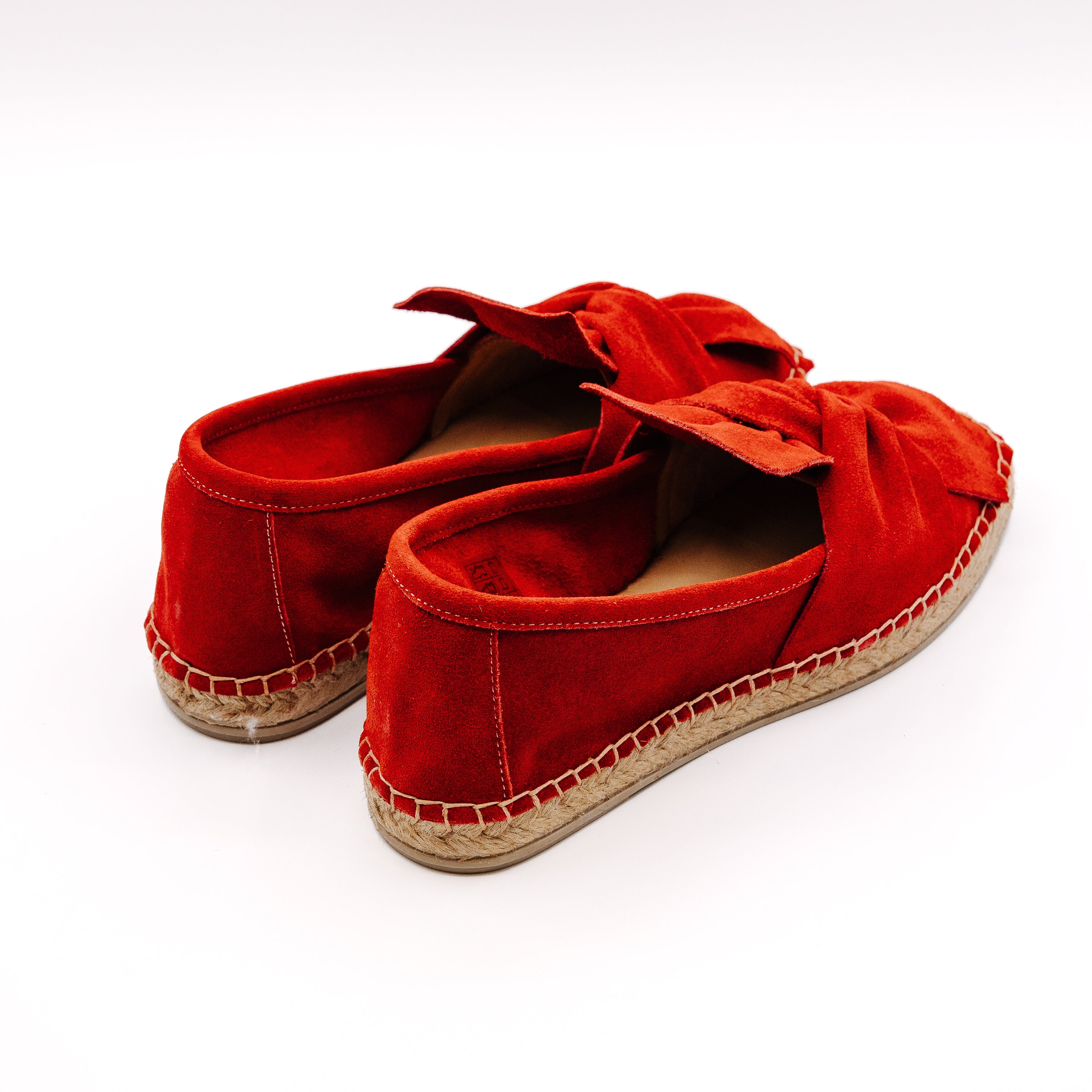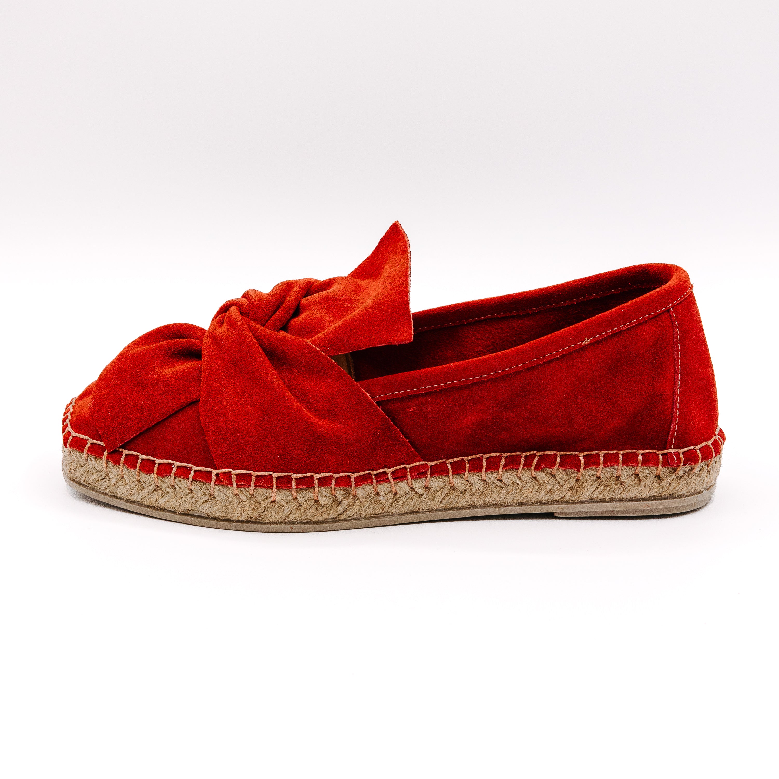 Ženske ravne espadrile od prevrnute kože u crvenoj boji sa čvor mašnom brenda Bueno.