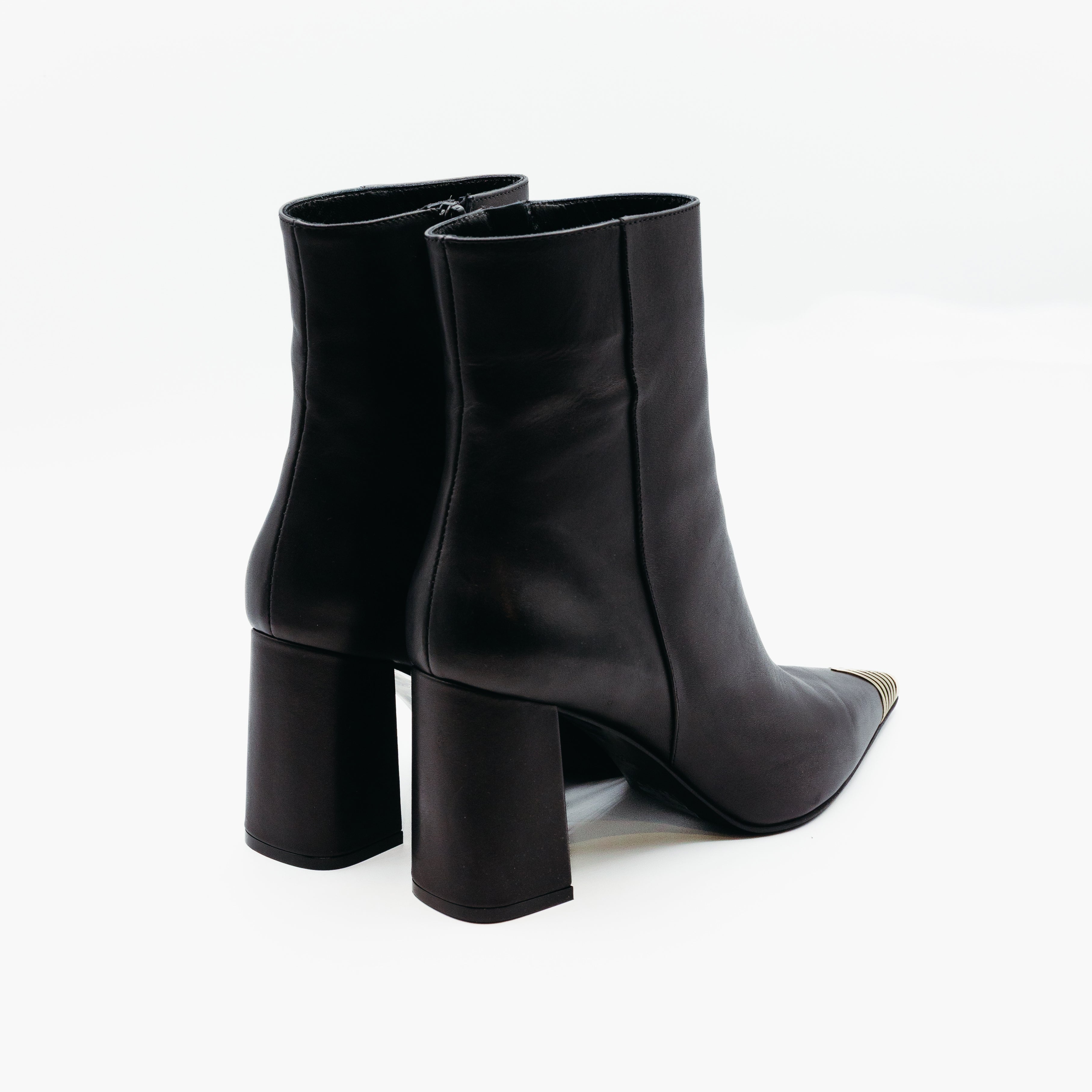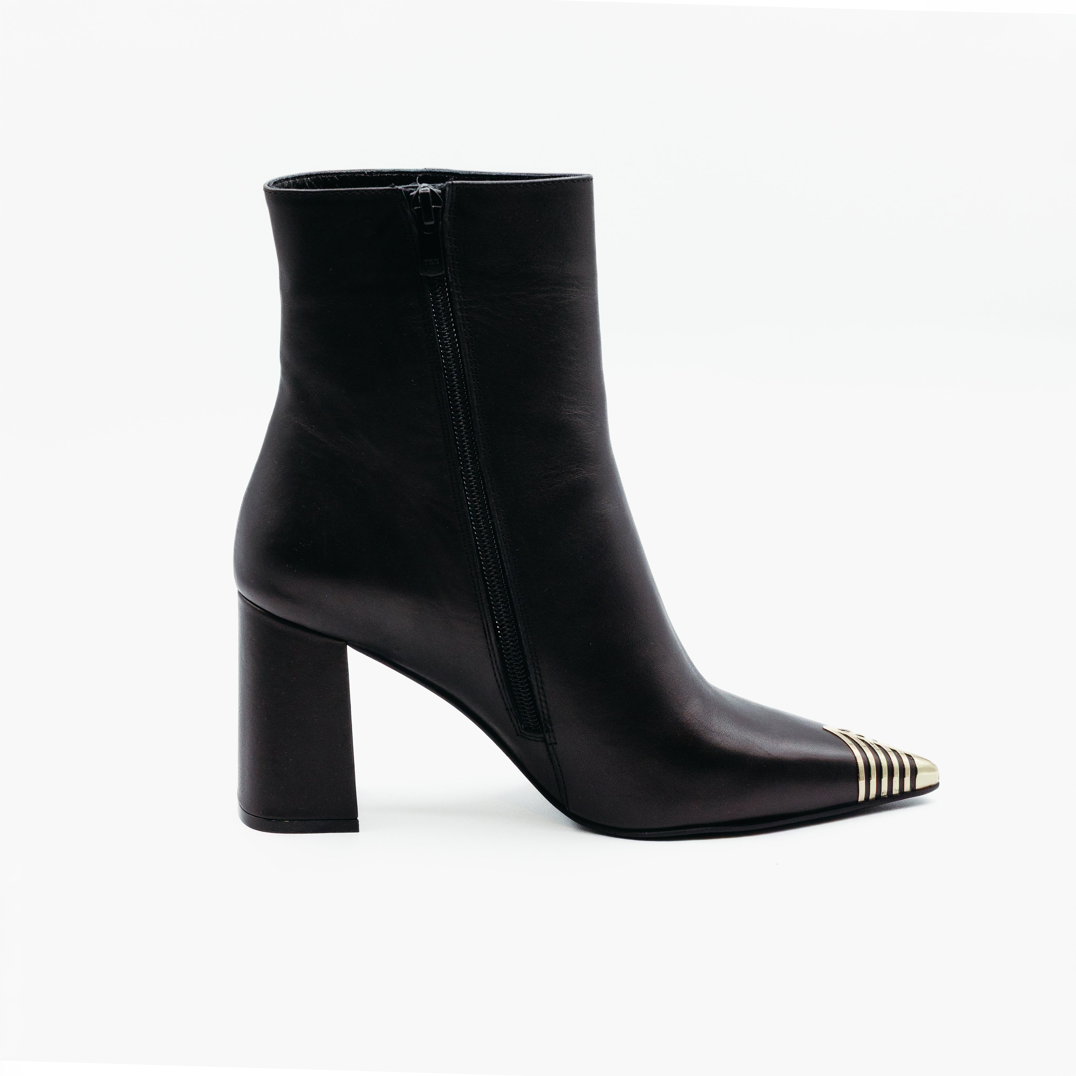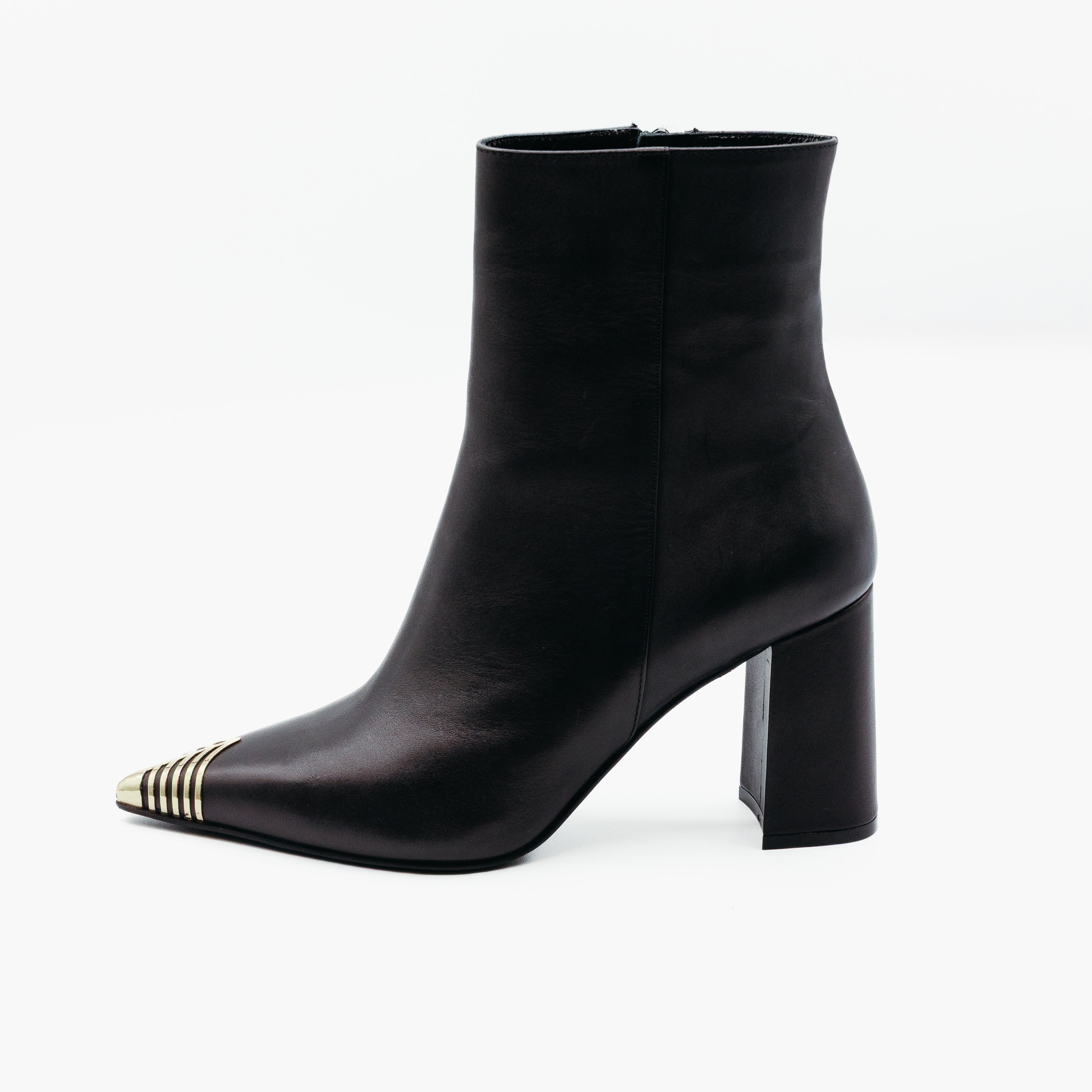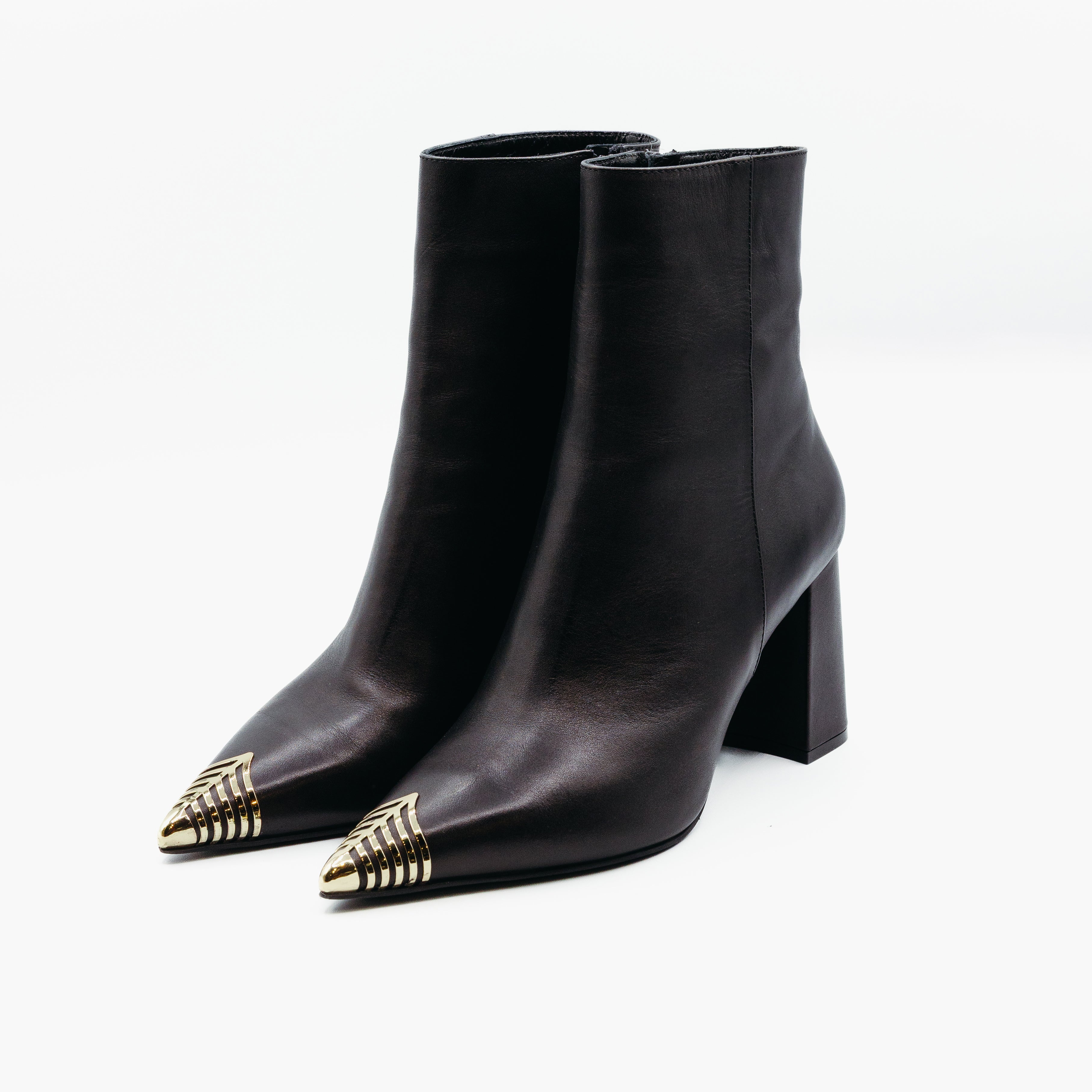 Ženske kožne čizme gležnjače na potpeticu u crnoj boji sa detaljem na špicu u zlatnoj boji i cibzarom sa unutrašnje strane brenda De Mazzio.