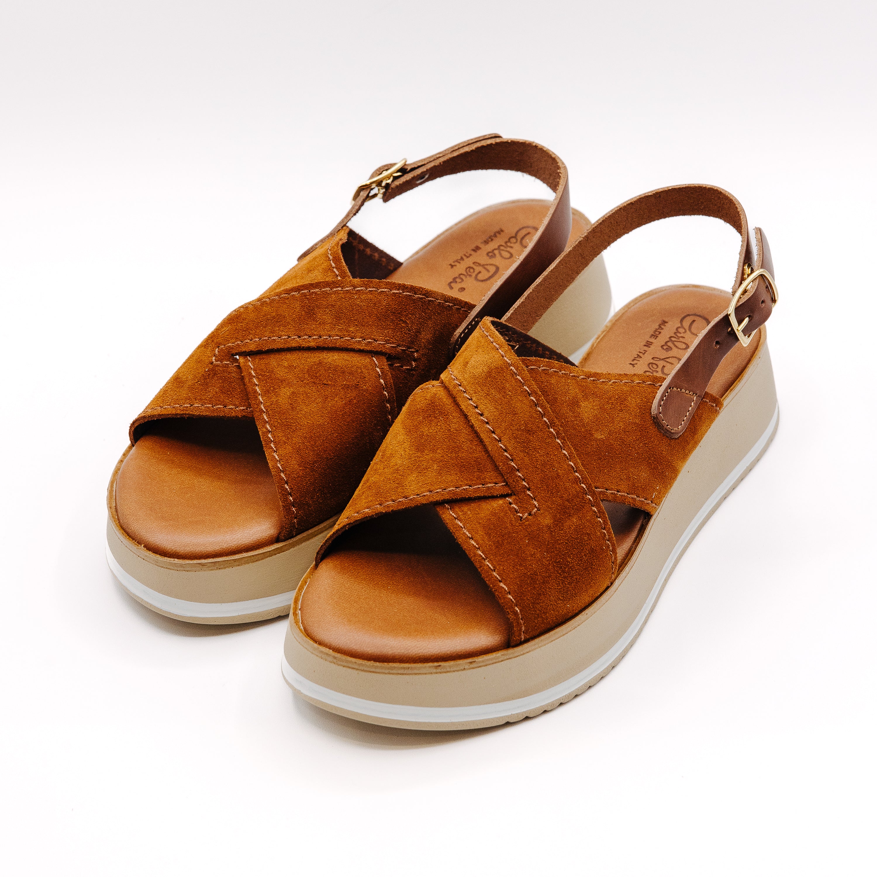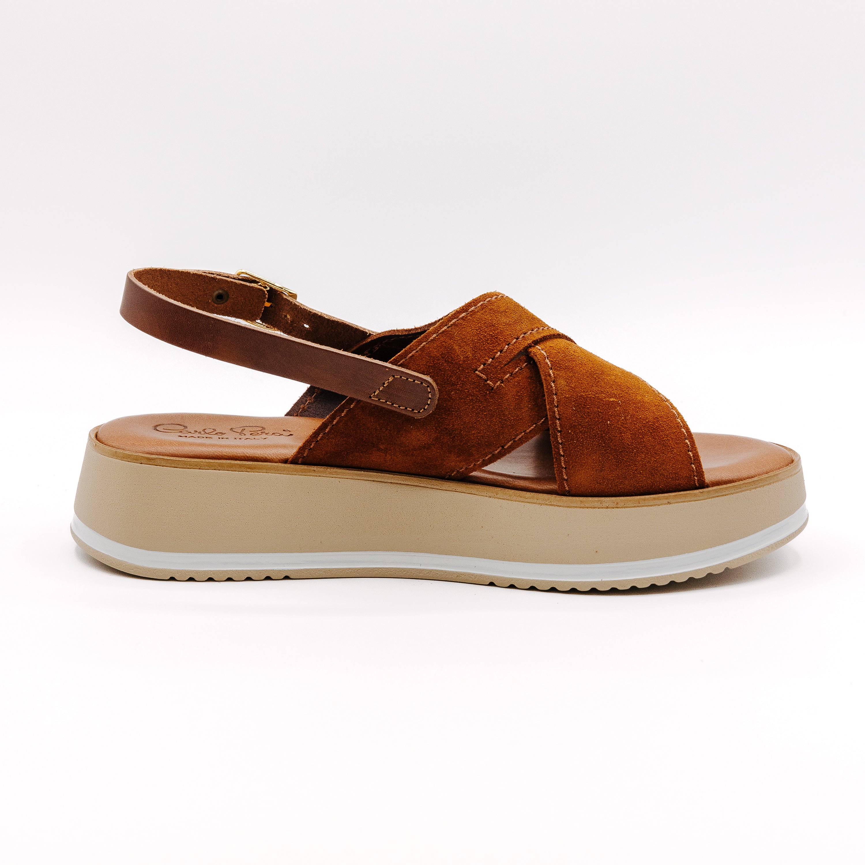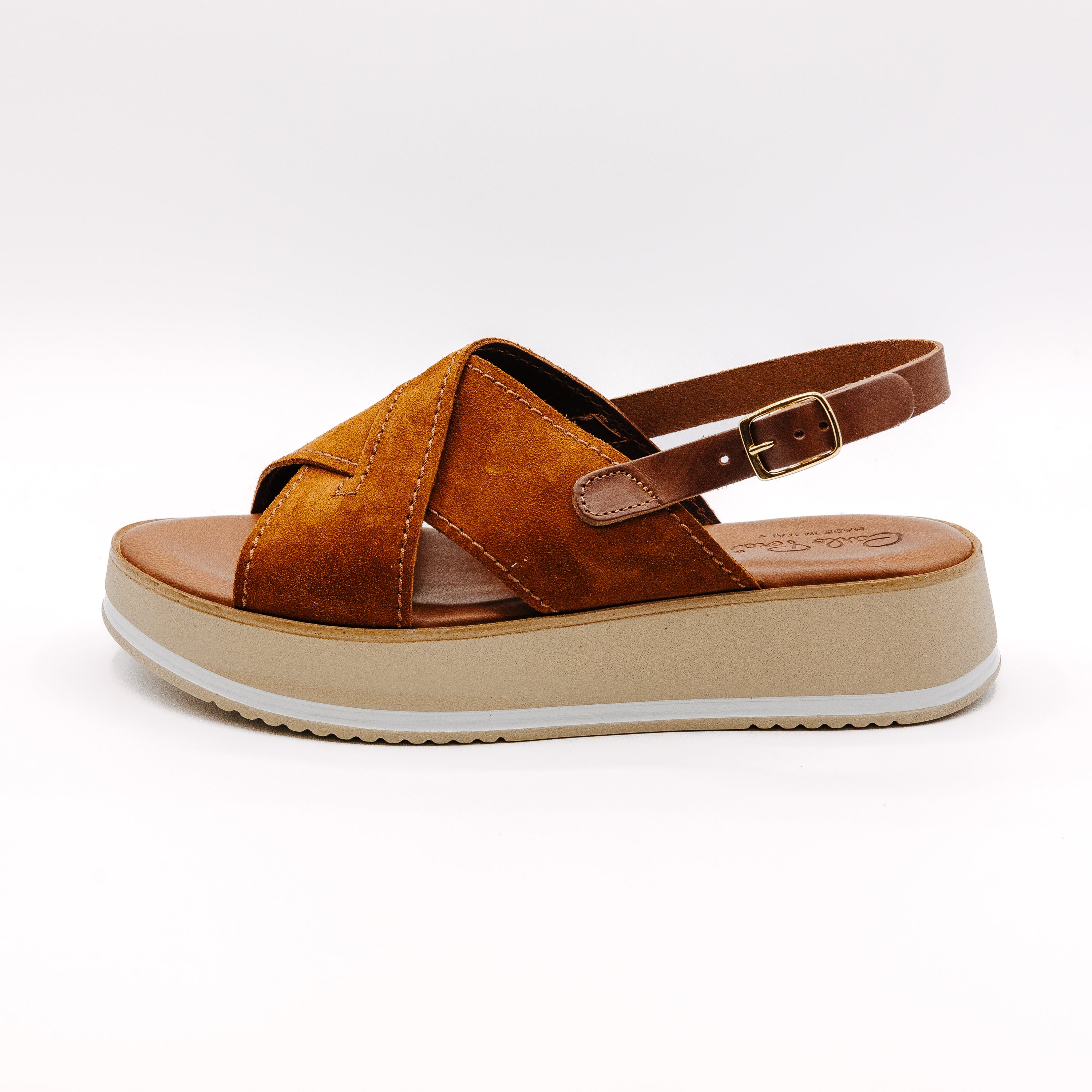 Kožne ženske sandale u braon boji sa izdignutim đonom i ukrštenim kaiševima brenda Pera Carlo.