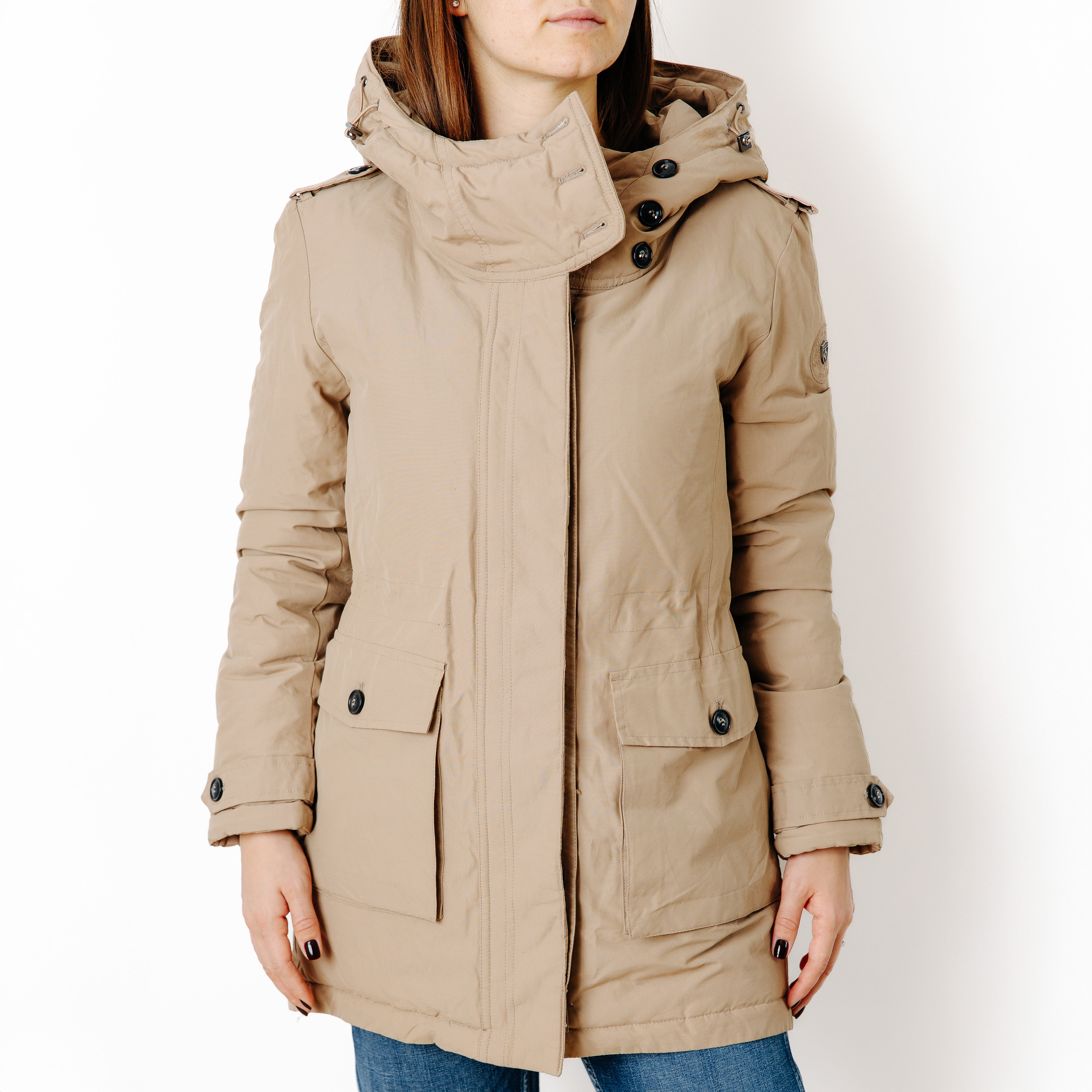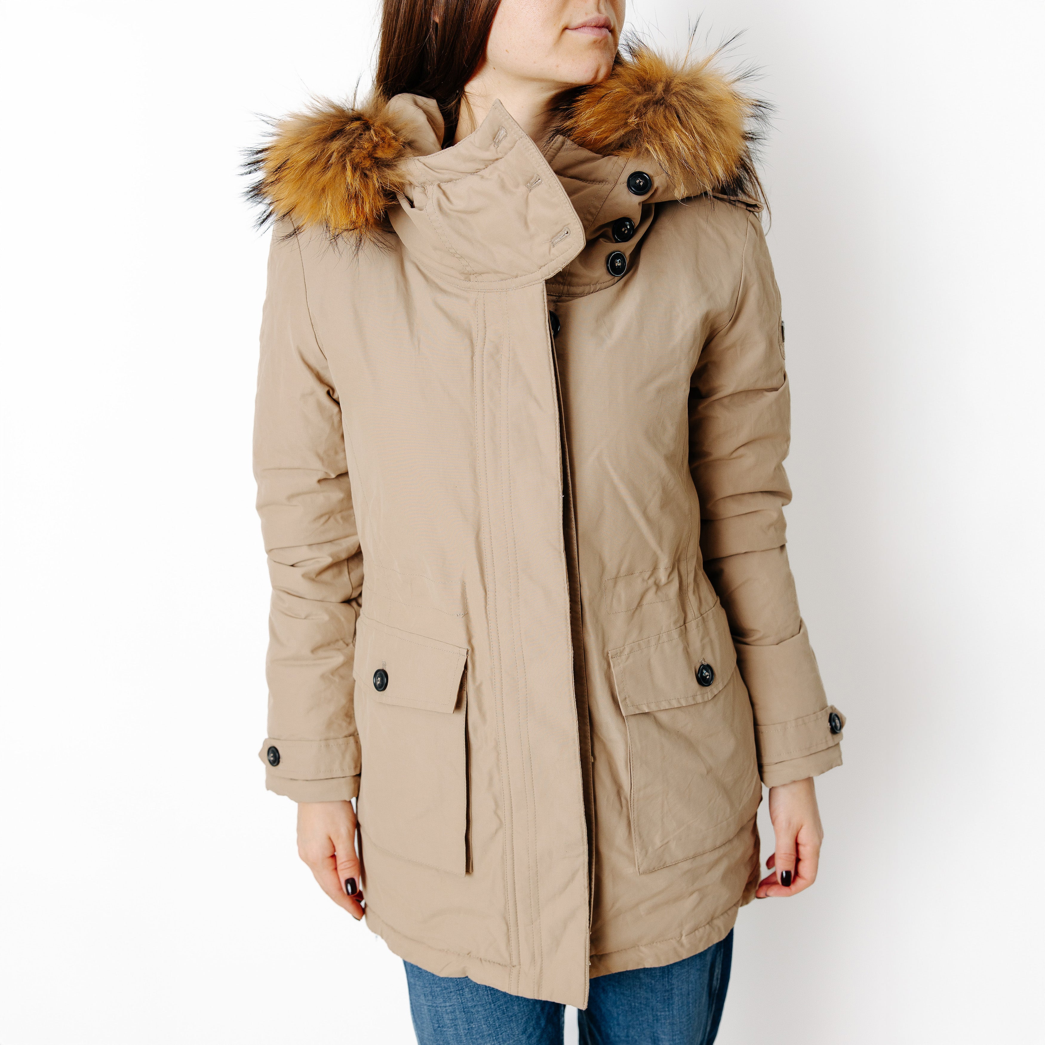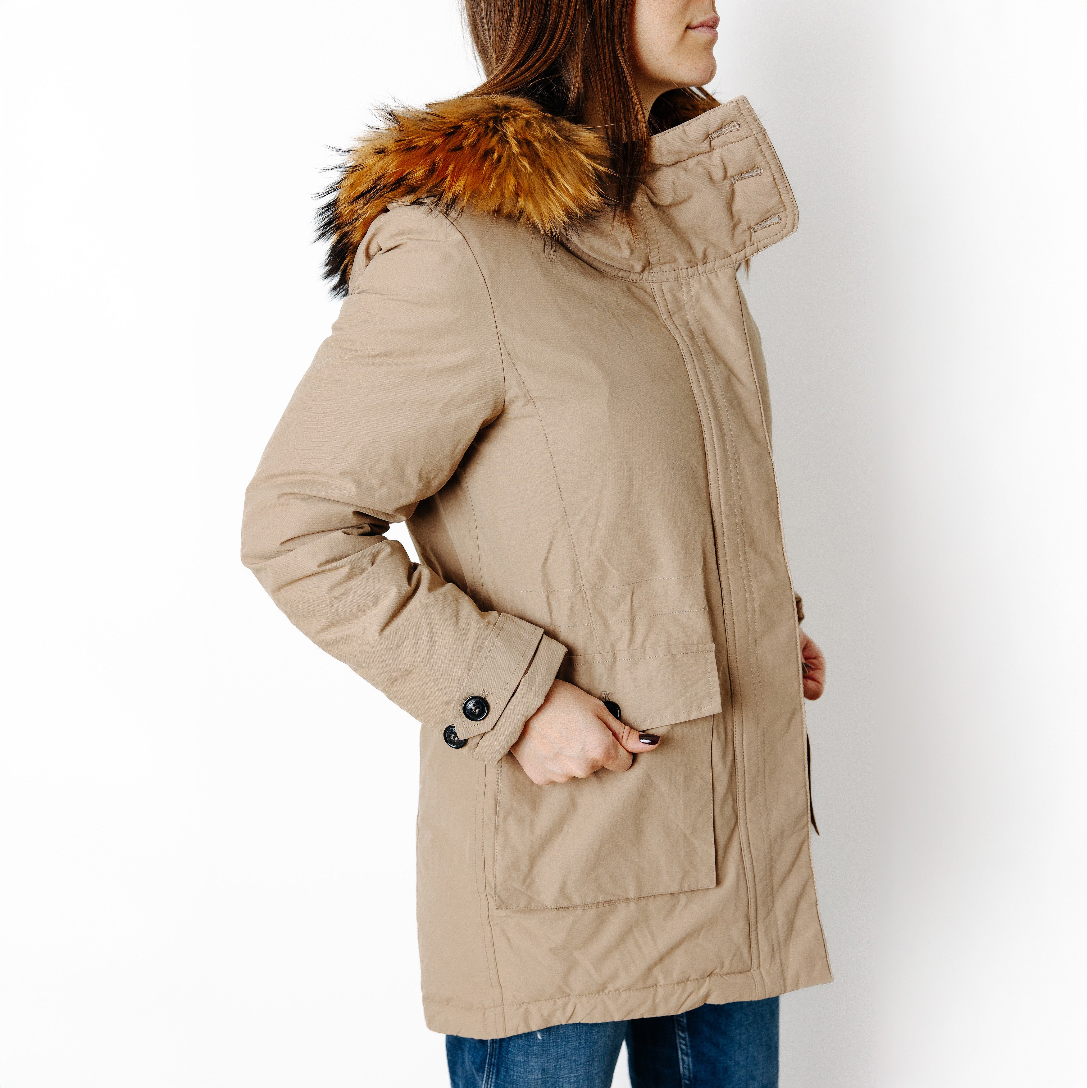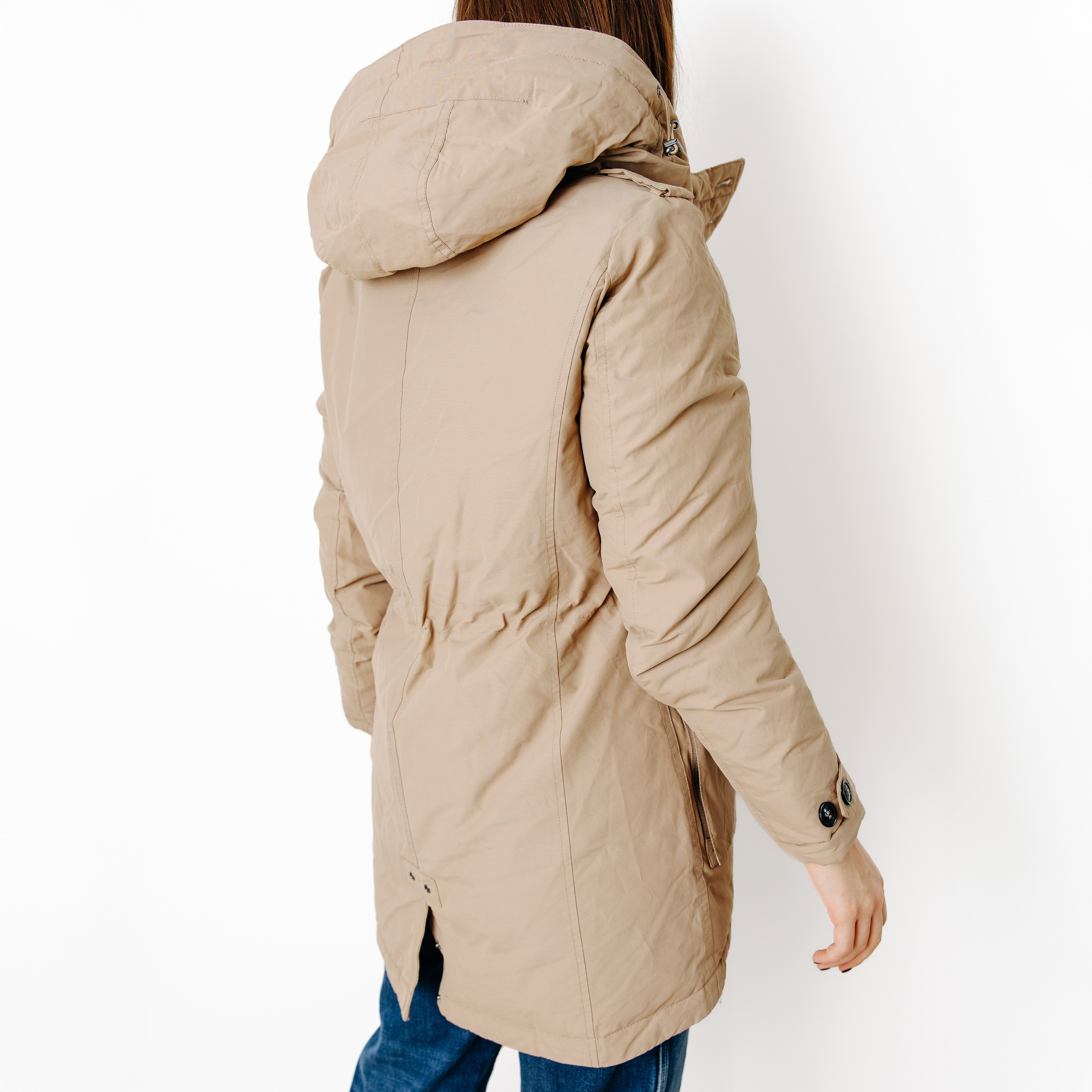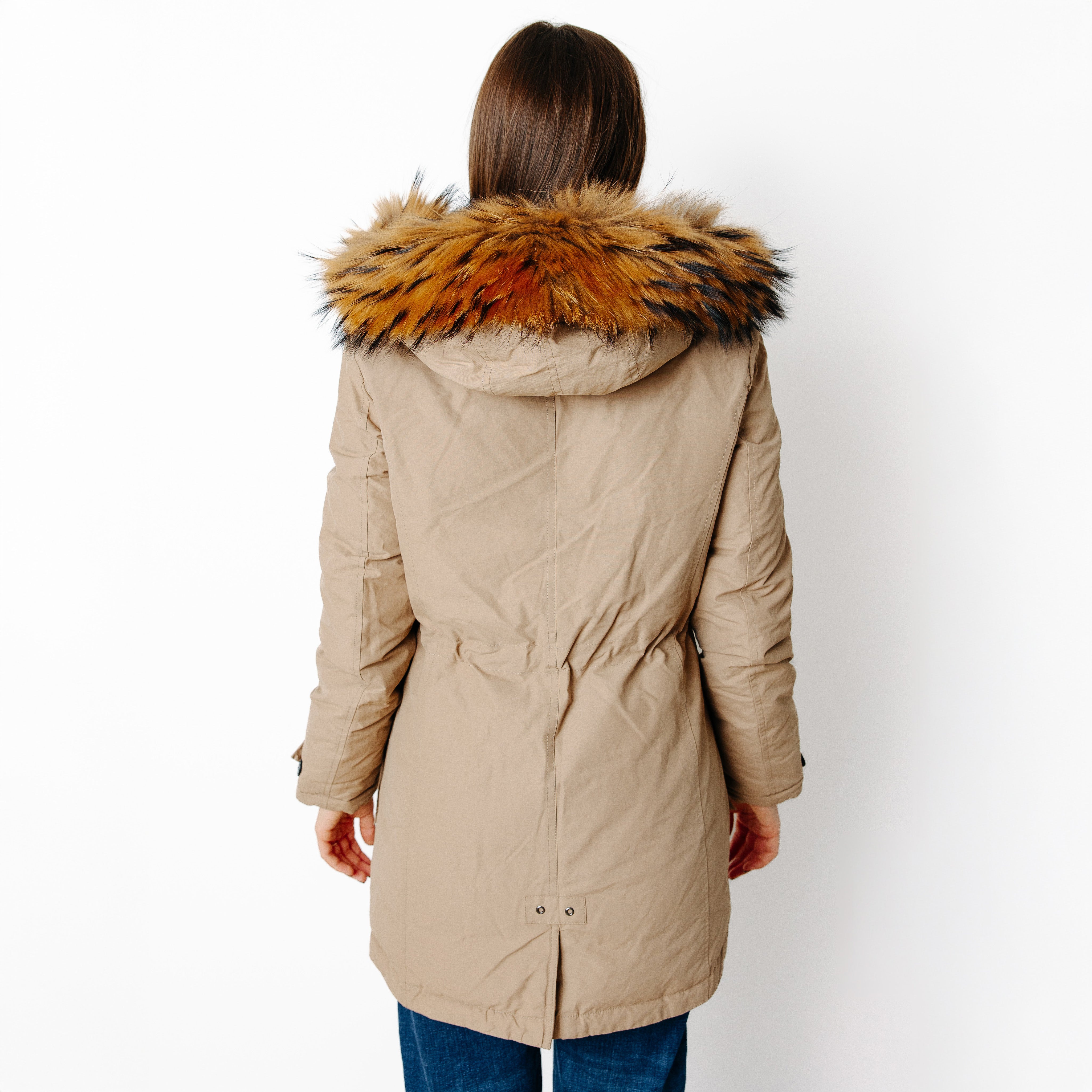 Ženska topla zimska jakna ALEX brenda Invento u bež boji sa podesivom skrivenom gumom oko struka, na cibzar, sa kapuljačom od prirodnog krzna rakuna koje se skida.
