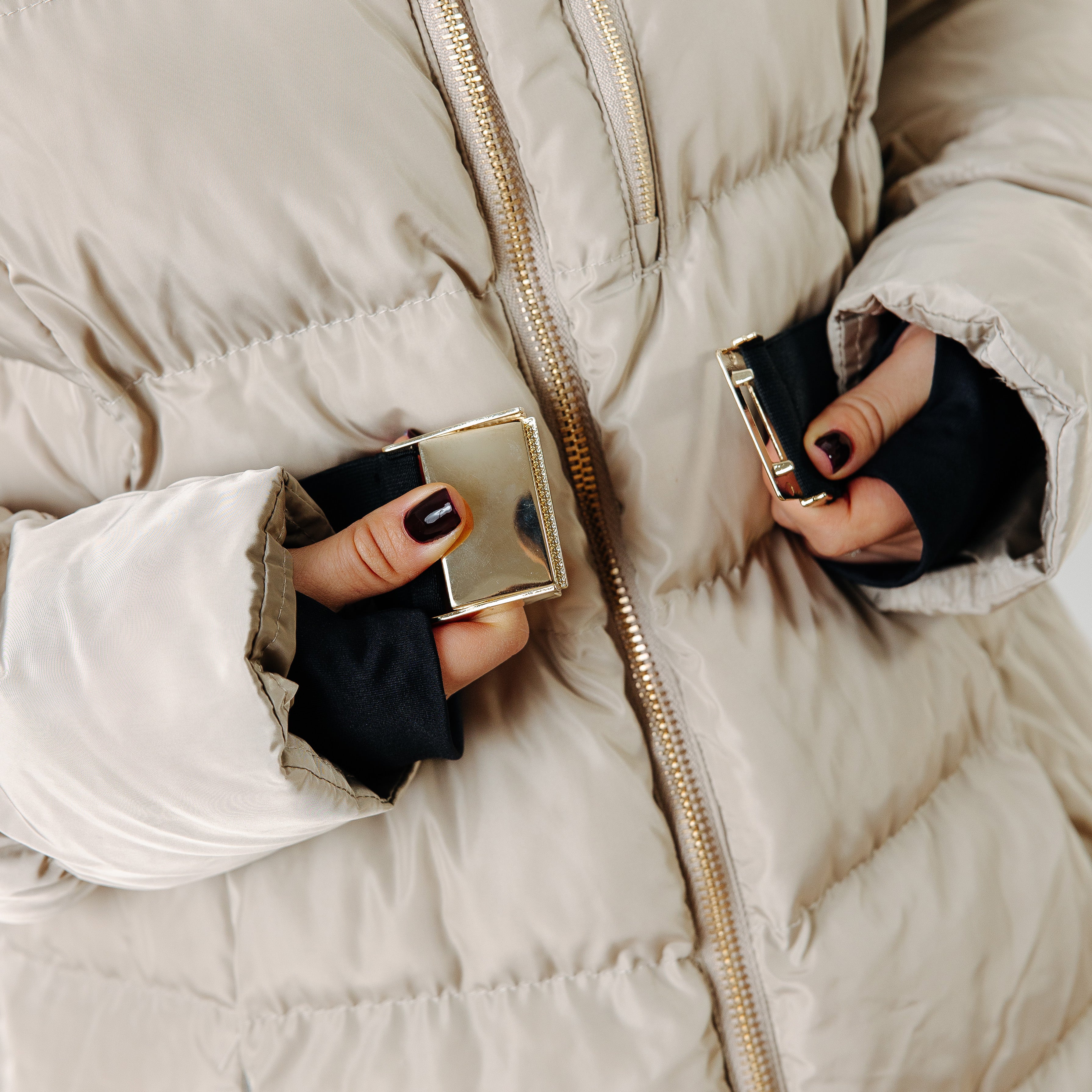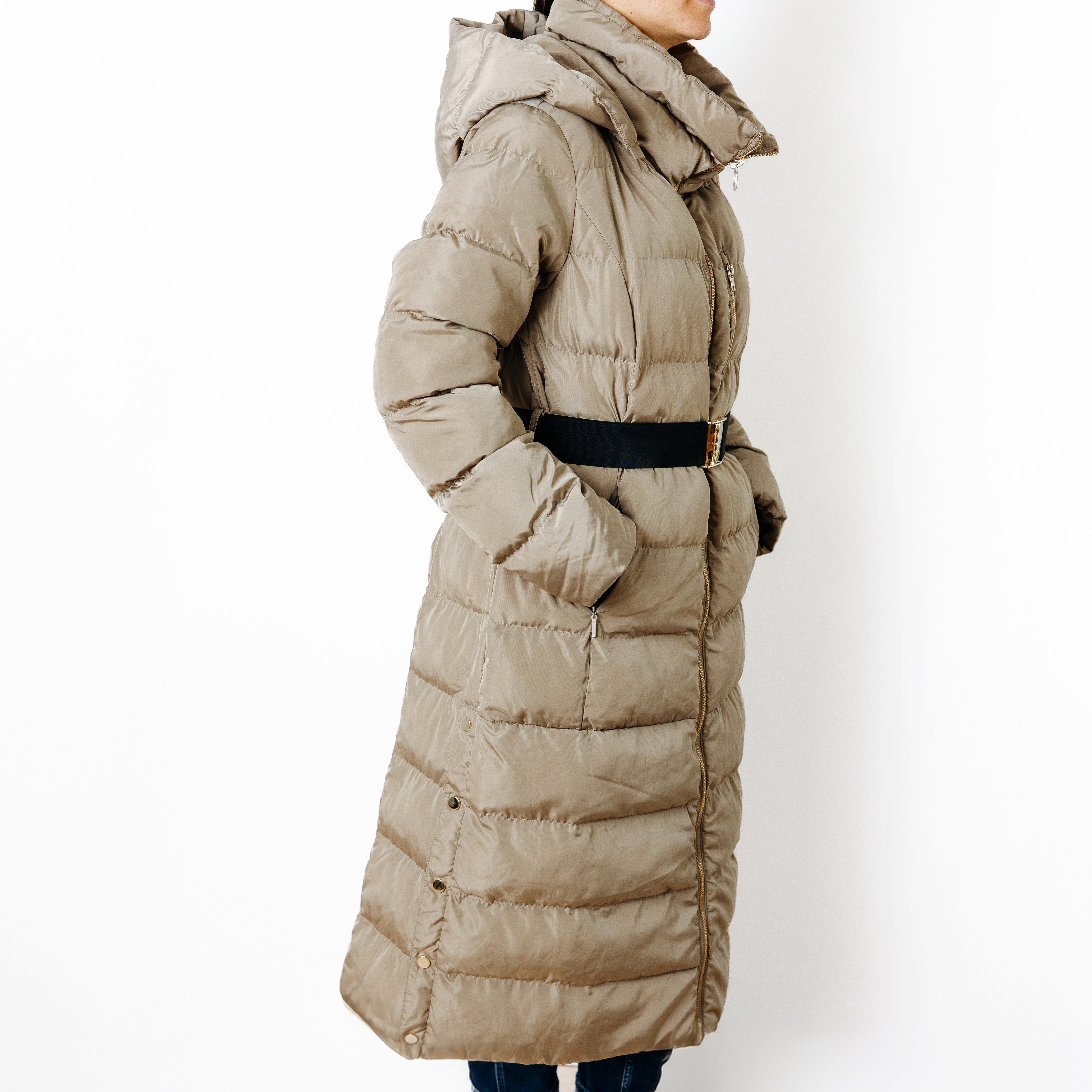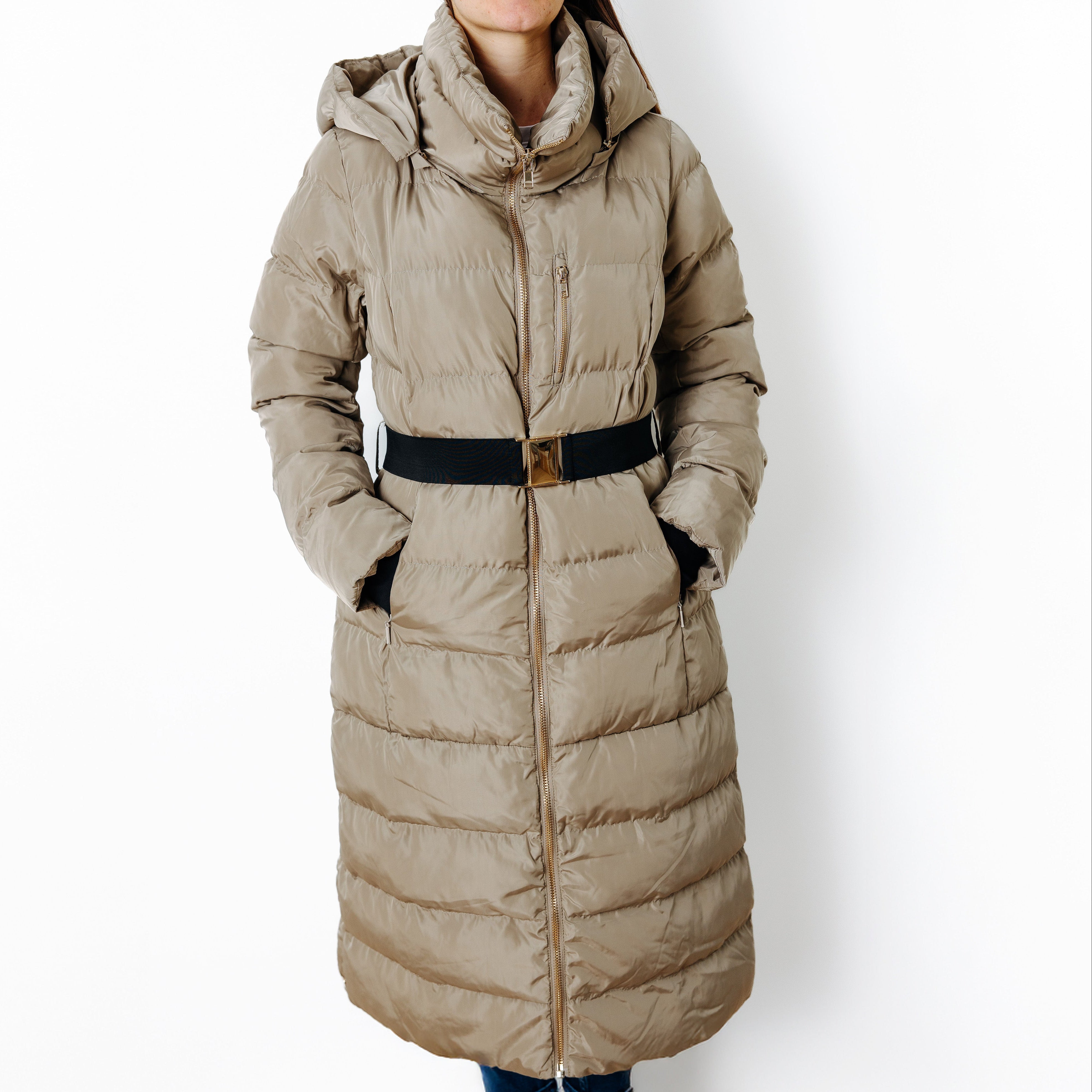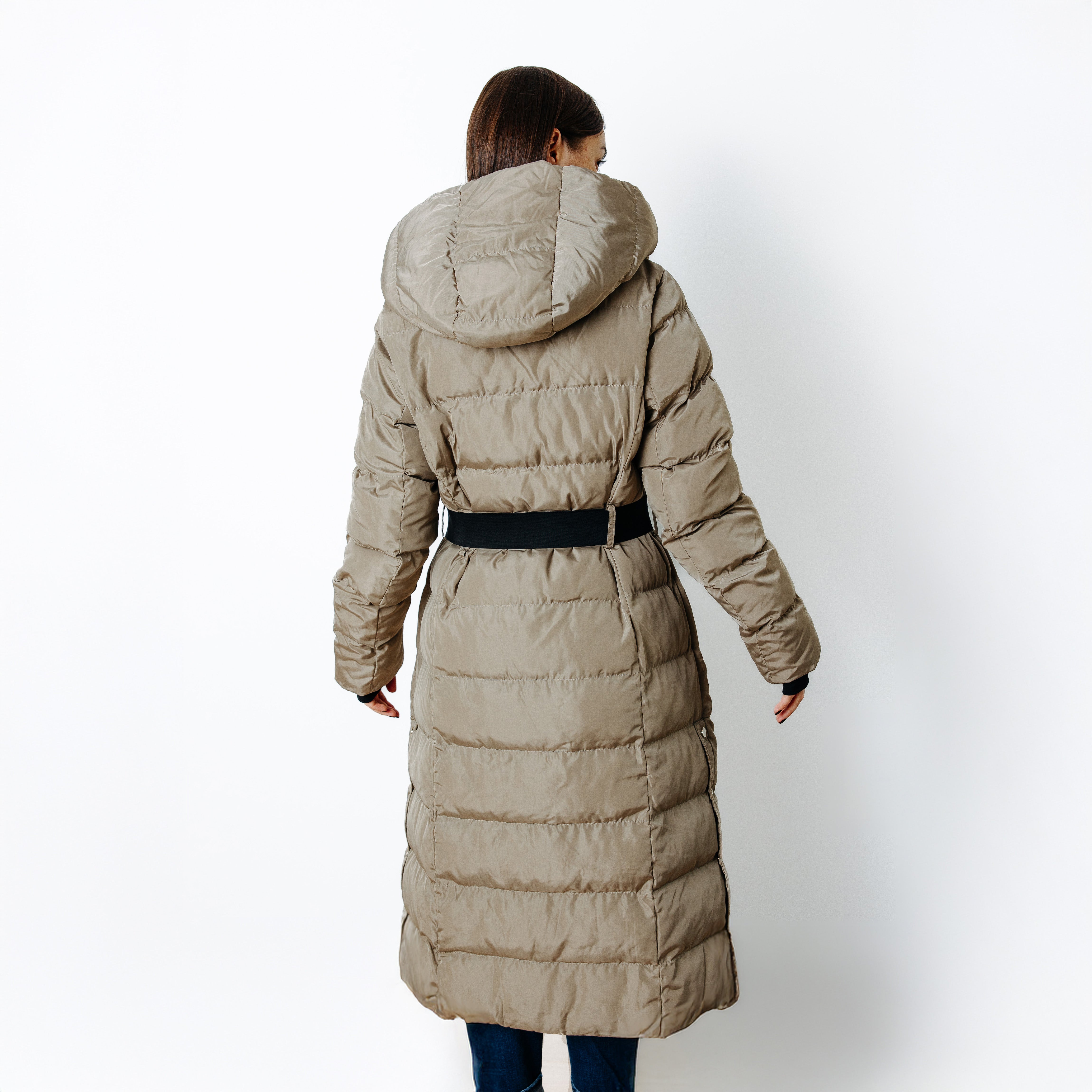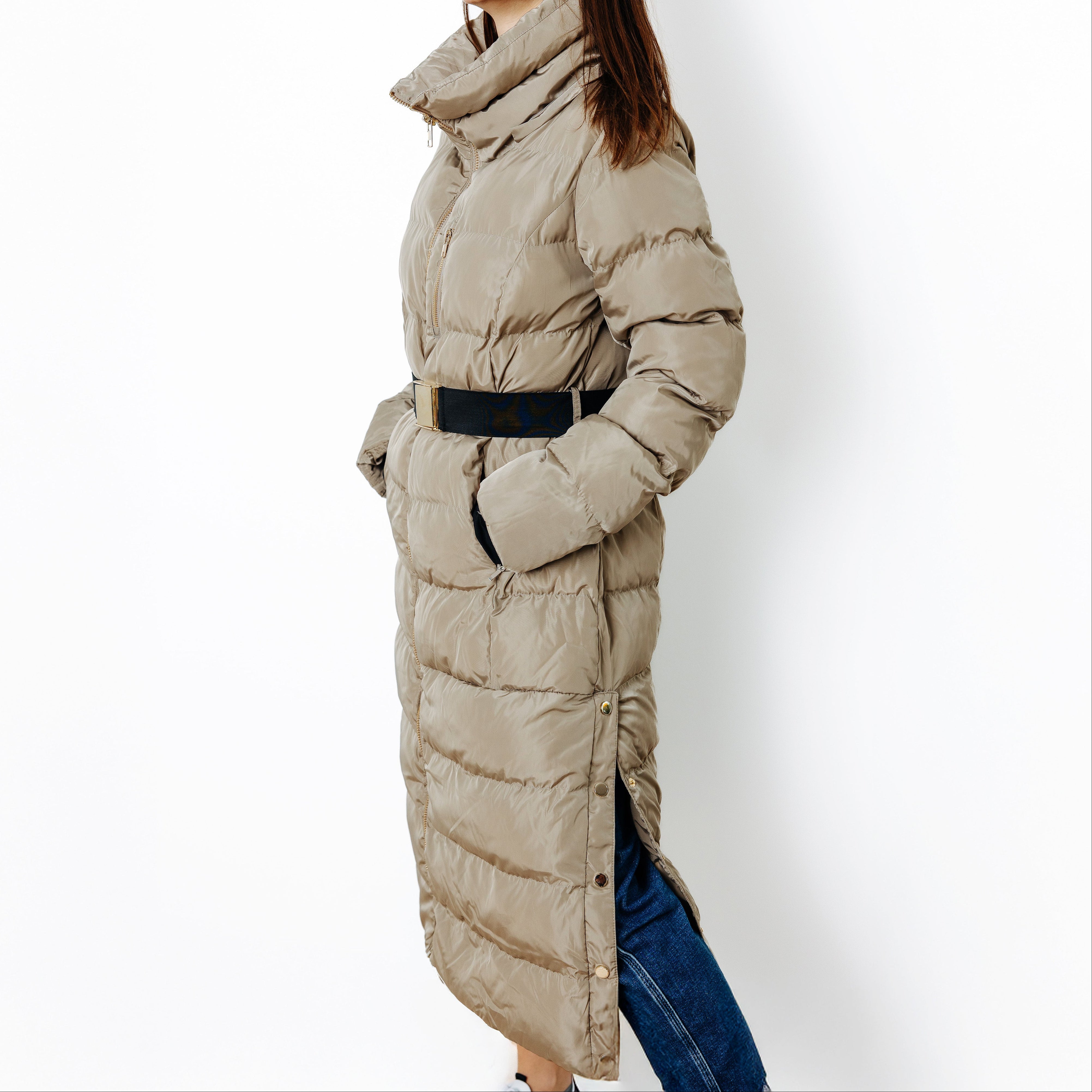 Duga ženska štepana jakna u bež boji sa zipom, lastiš pojasom crne boje i kapuljačom koja se skida brenda Noa Noir.