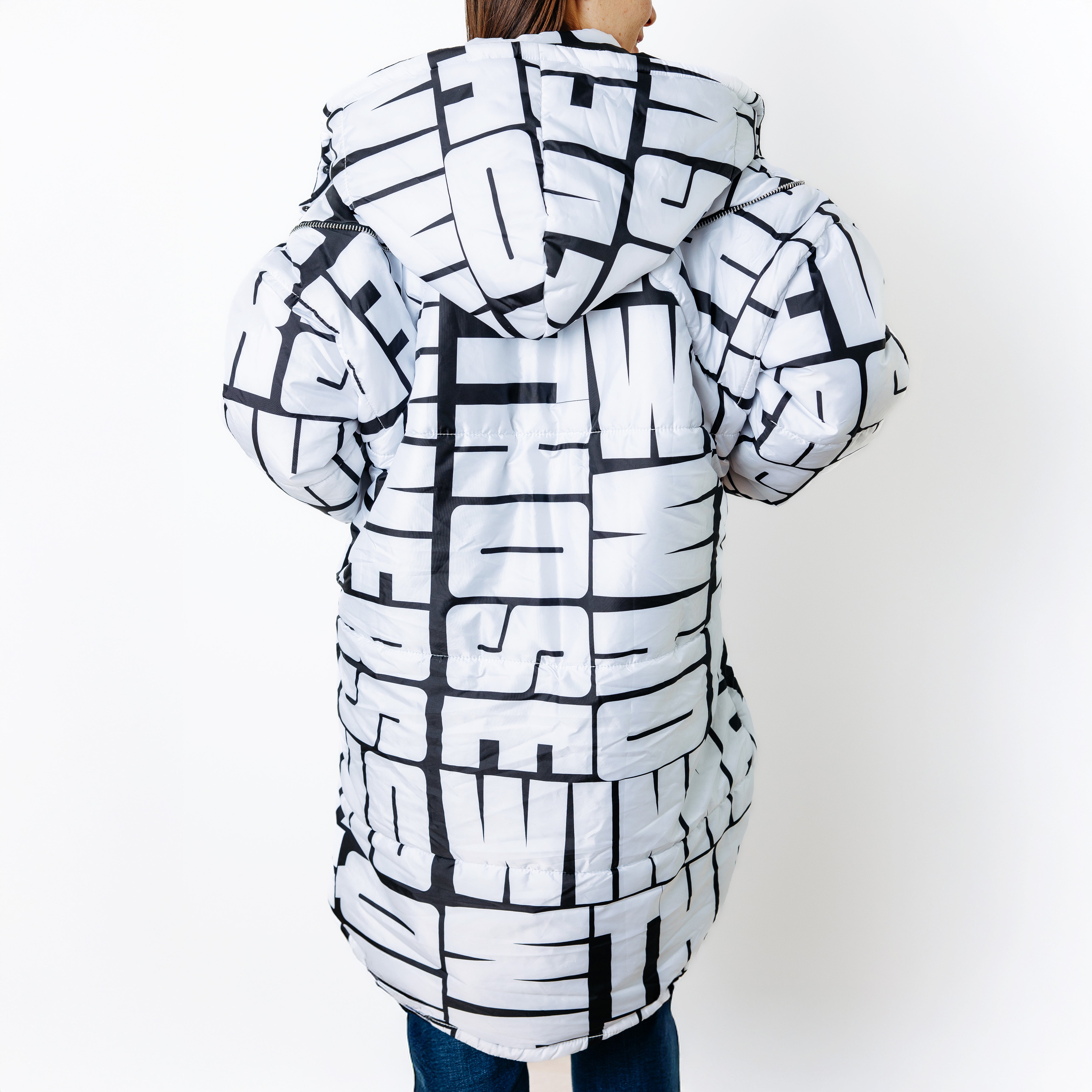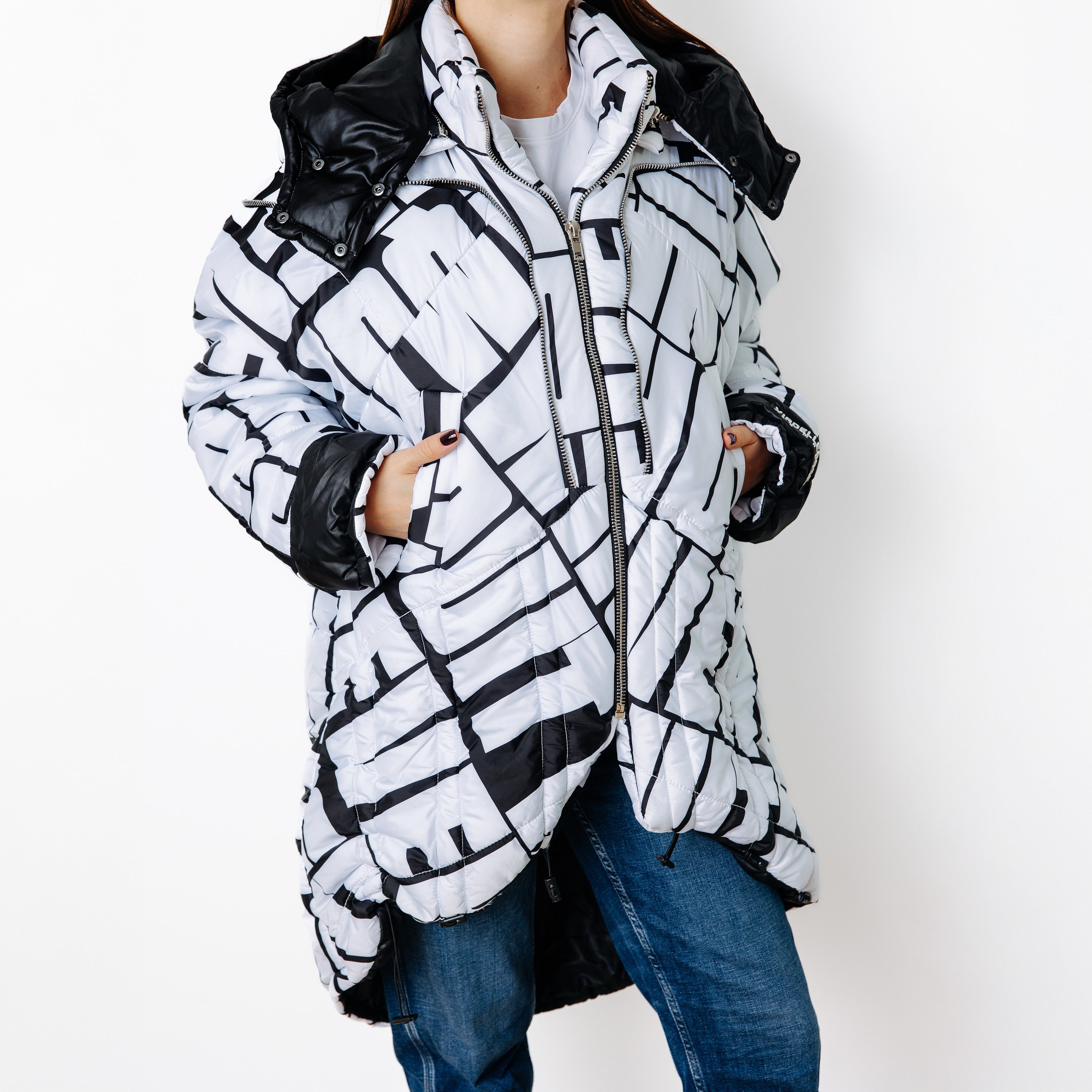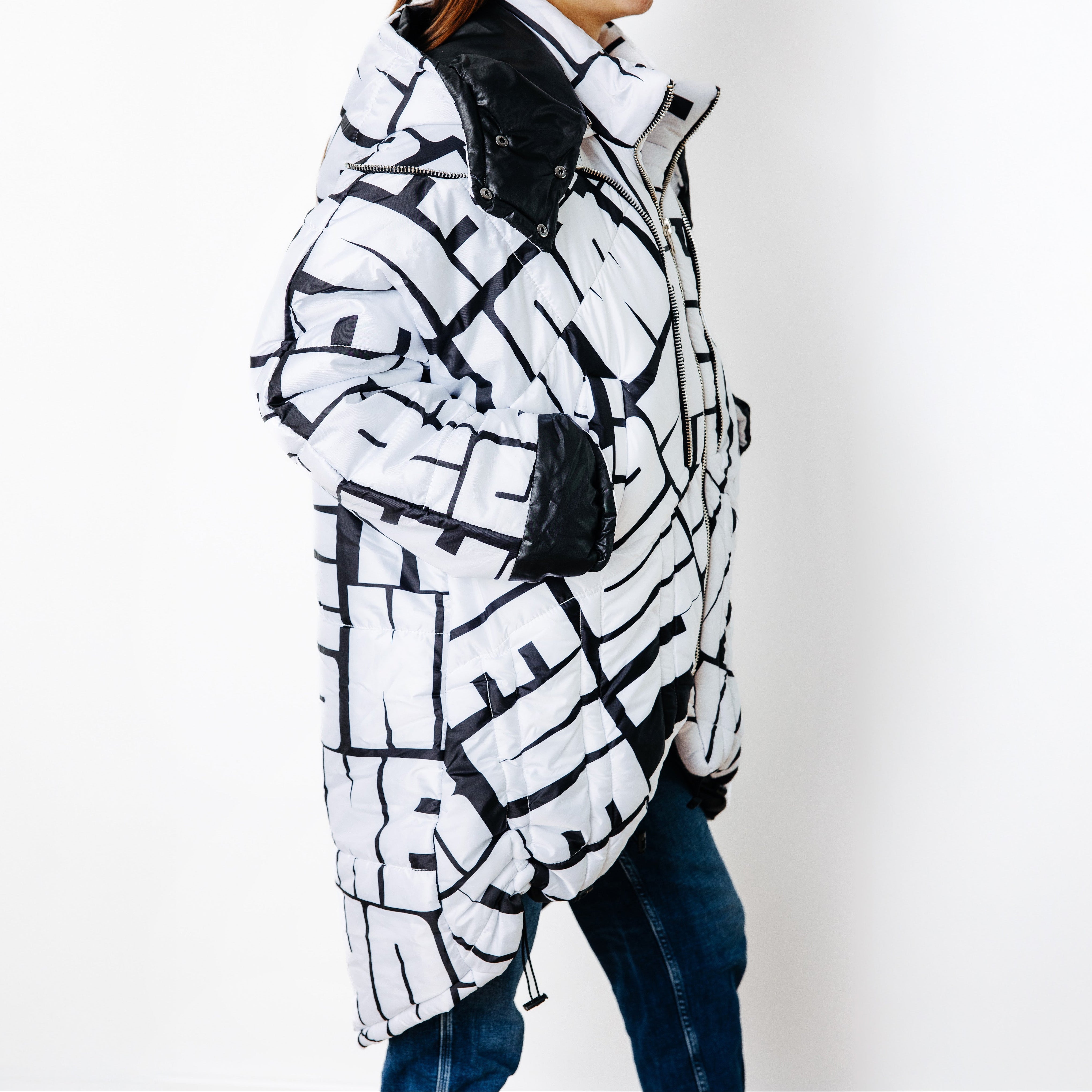 Ženska zimska jakna na cibzar u crno-belom printu sa kapuljačom koja se skida brenda VDR.