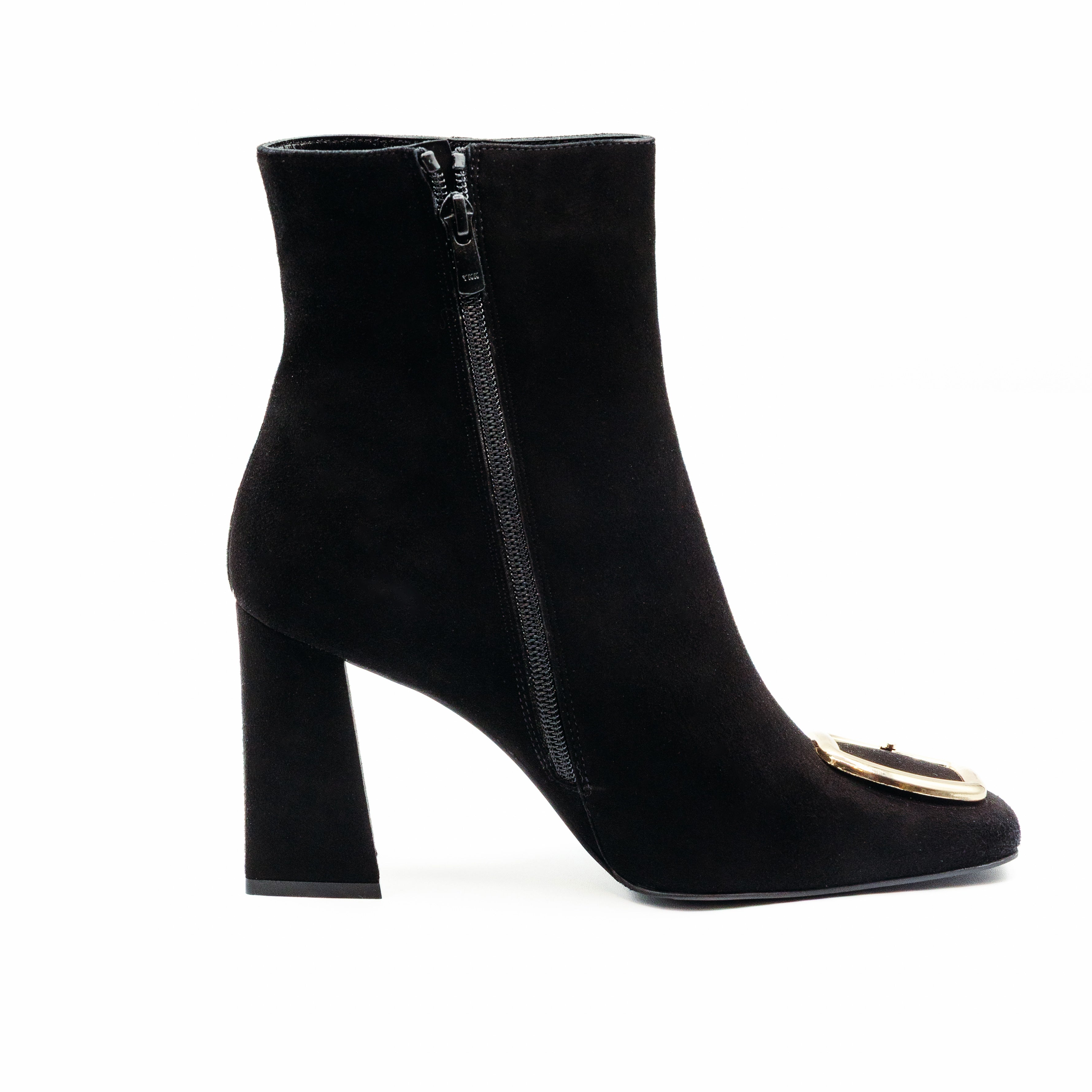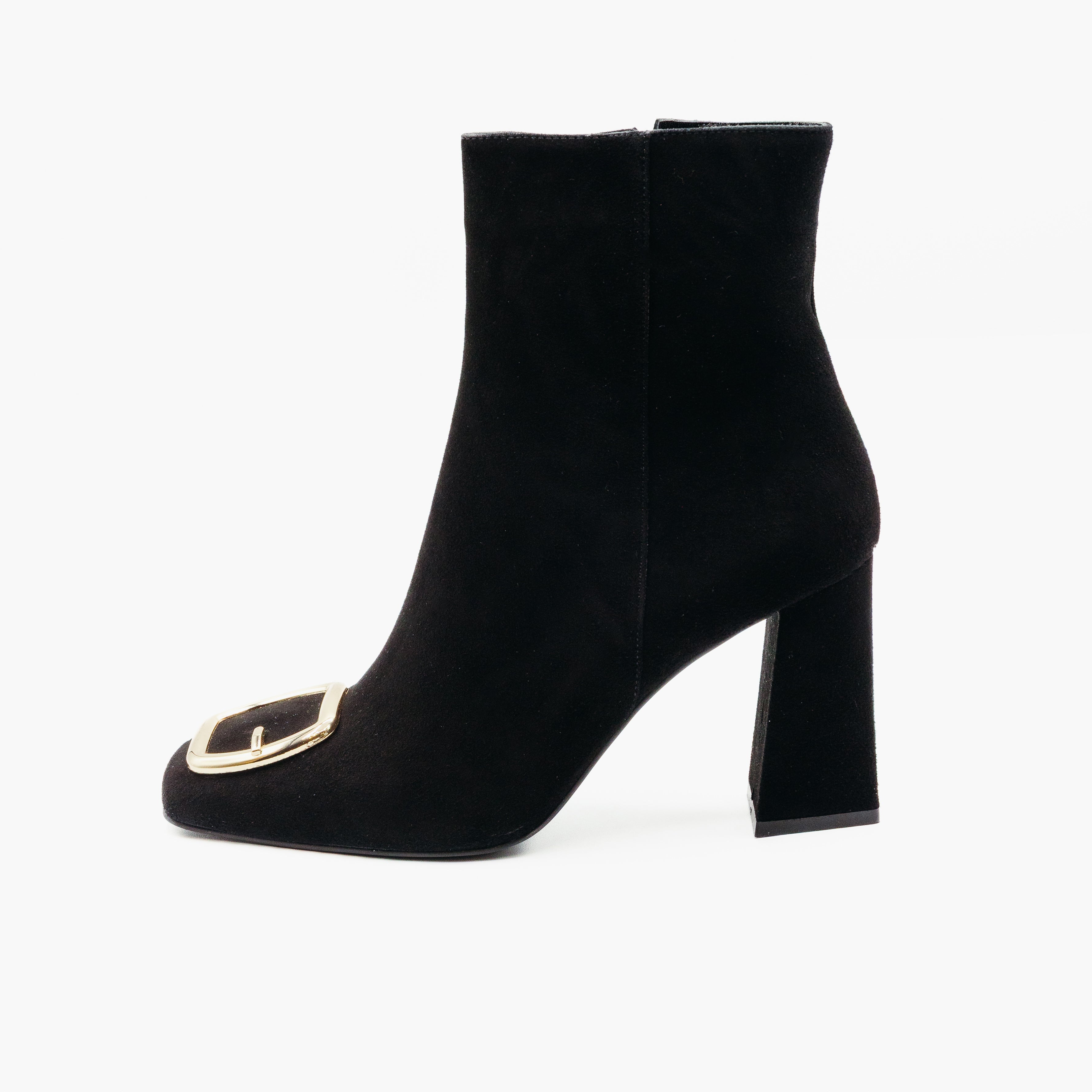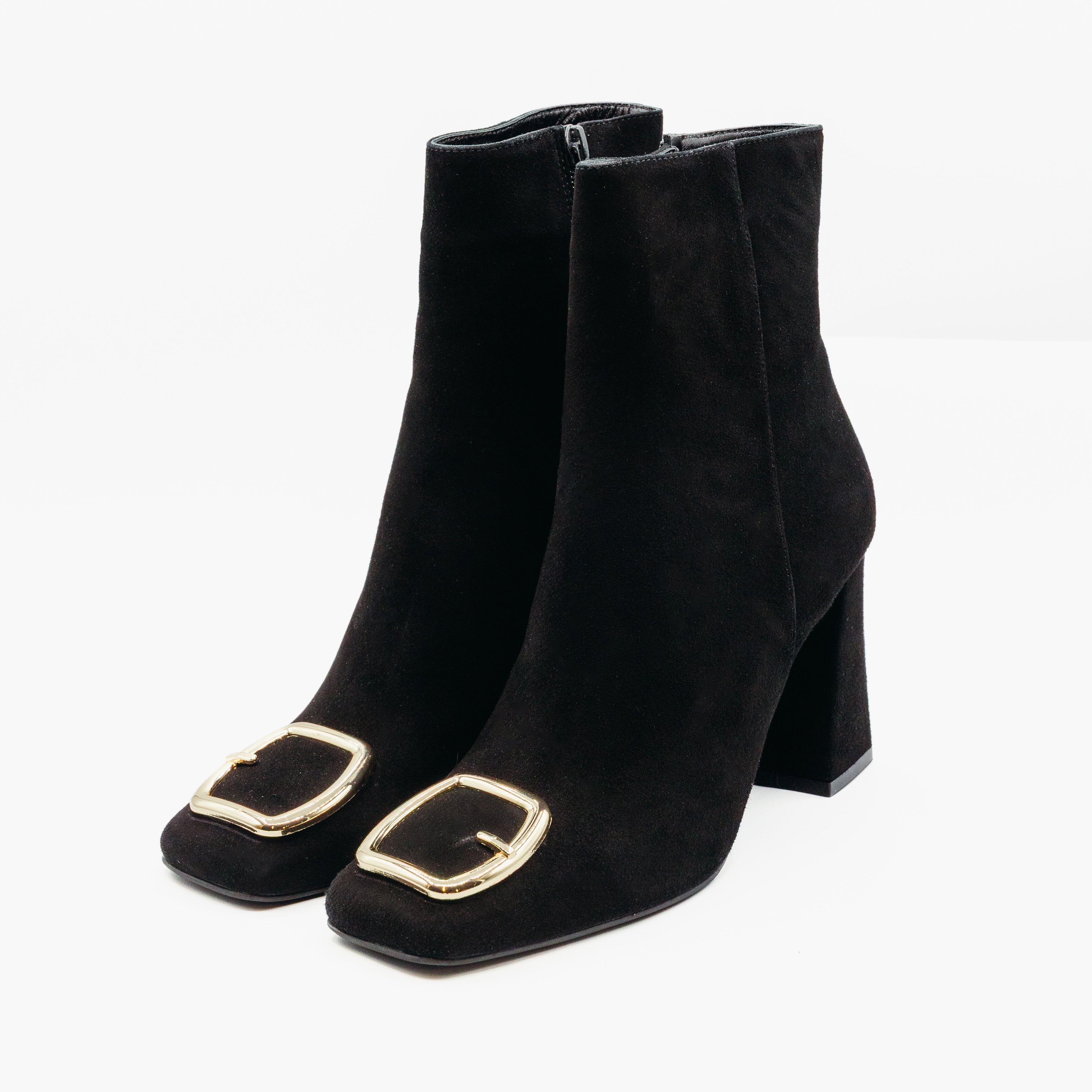 Ženske čizme od prevrnute kože u crnoj boji četvrtastog oblika sa šnalom zlatne boje kao detaljem i cibzarom sa unutrašnje strane brenda De Mazzio.
