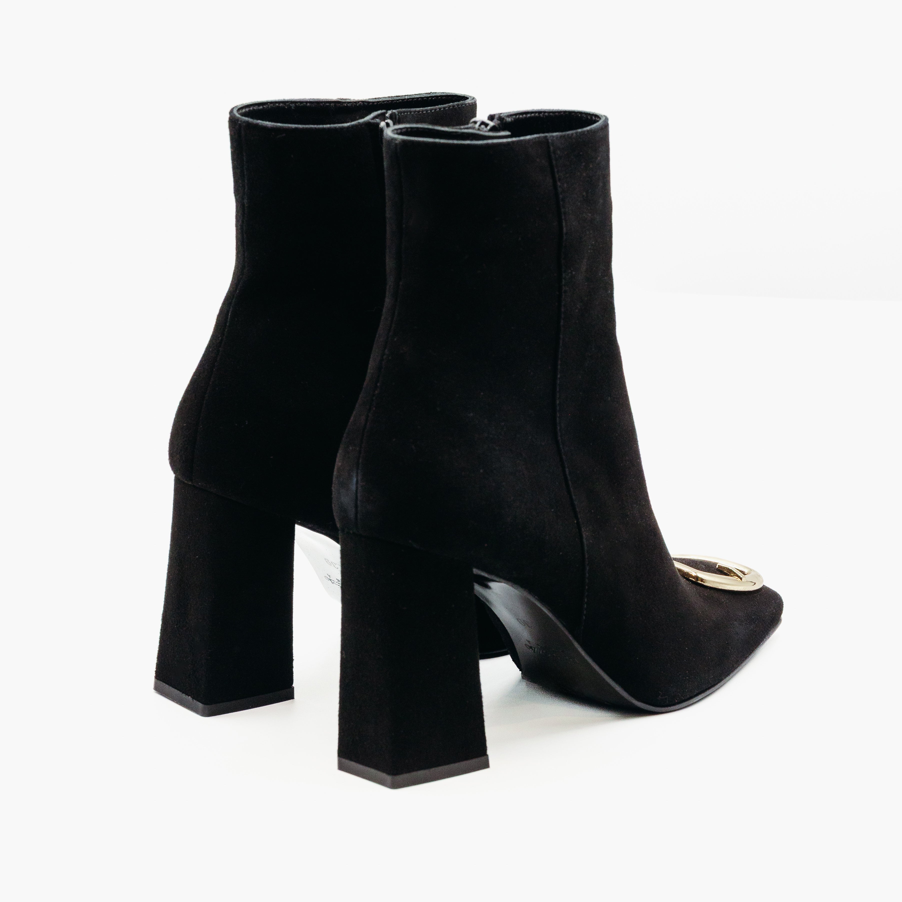 17,990.00 RSD9,990.00 RSDŽenske kožne čizme gležnjače na potpeticu u crnoj boji sa detaljem na špicu u zlatnoj boji i cibz... -