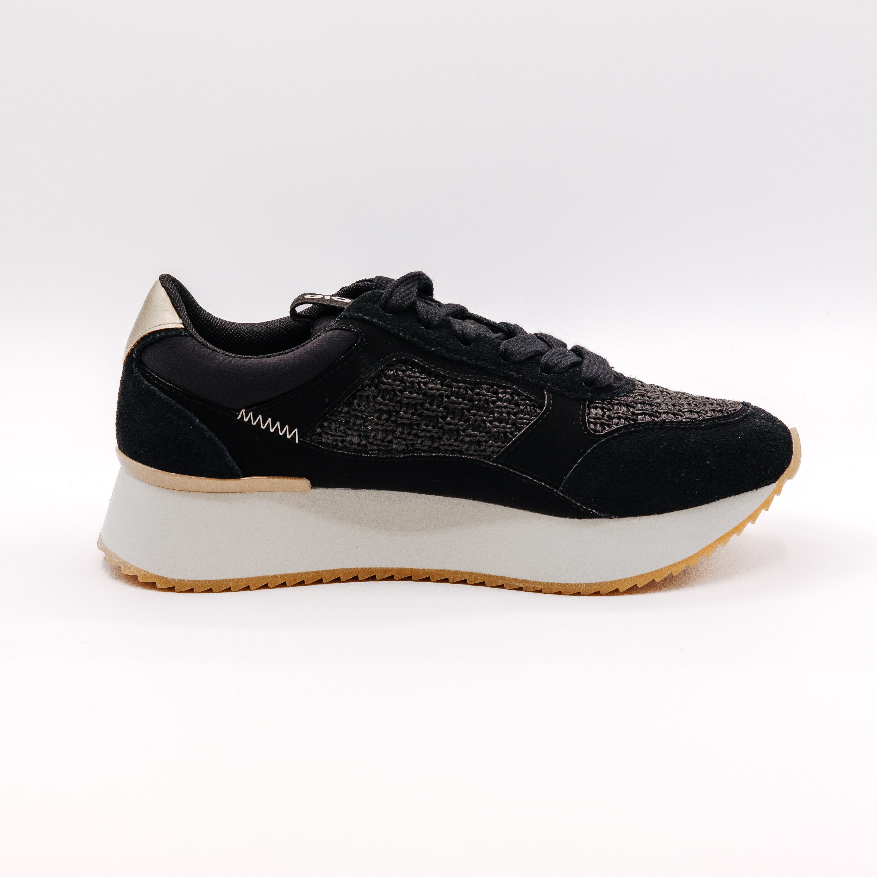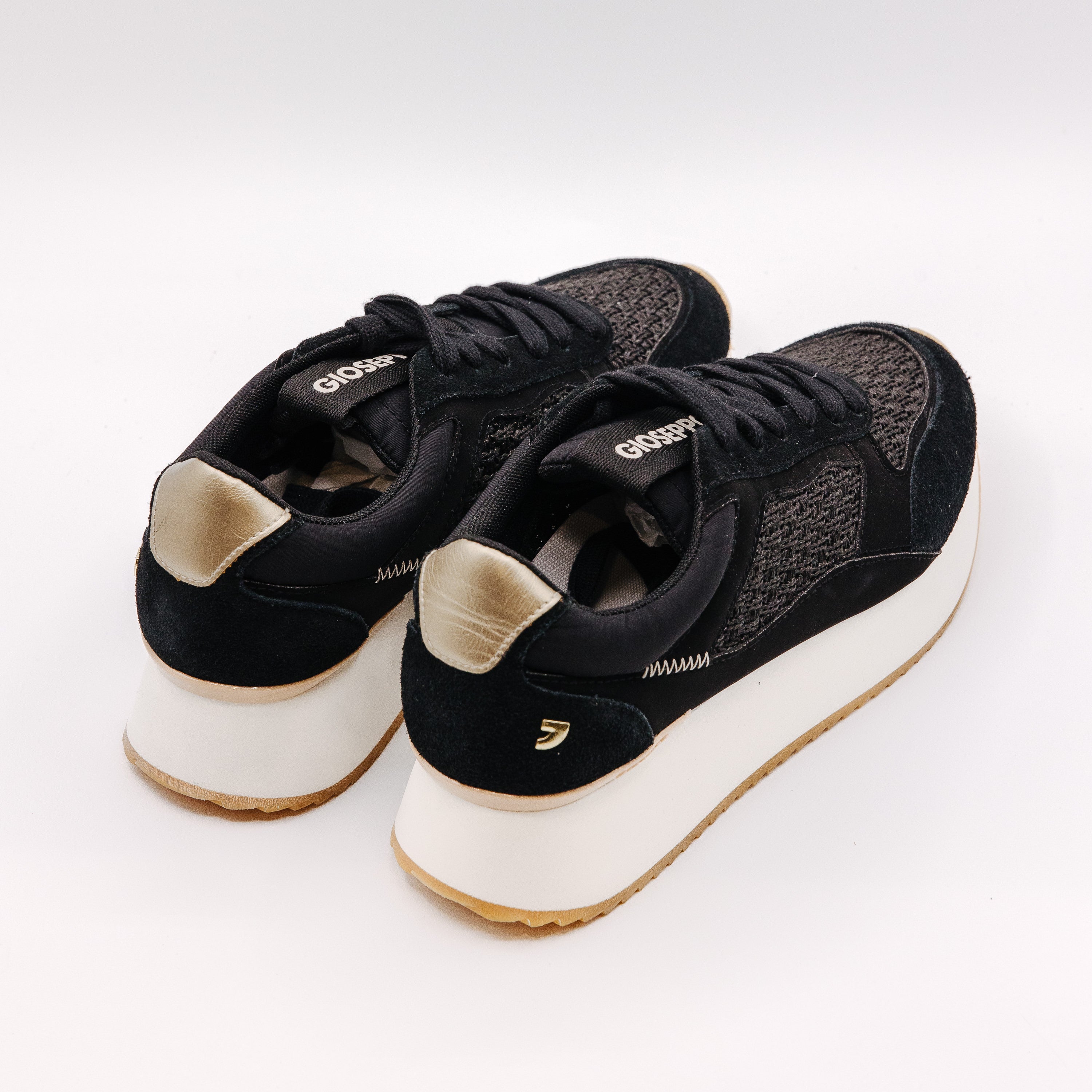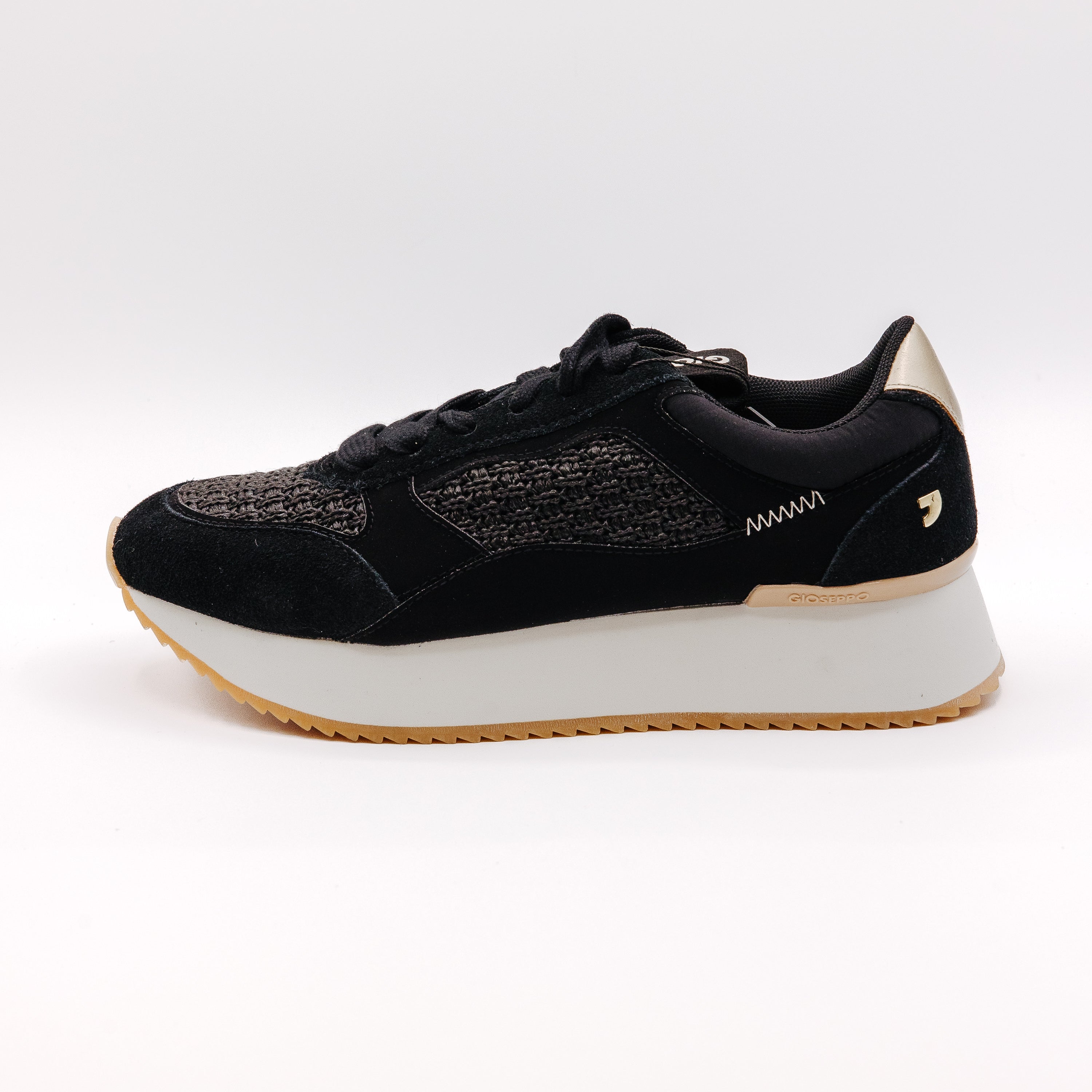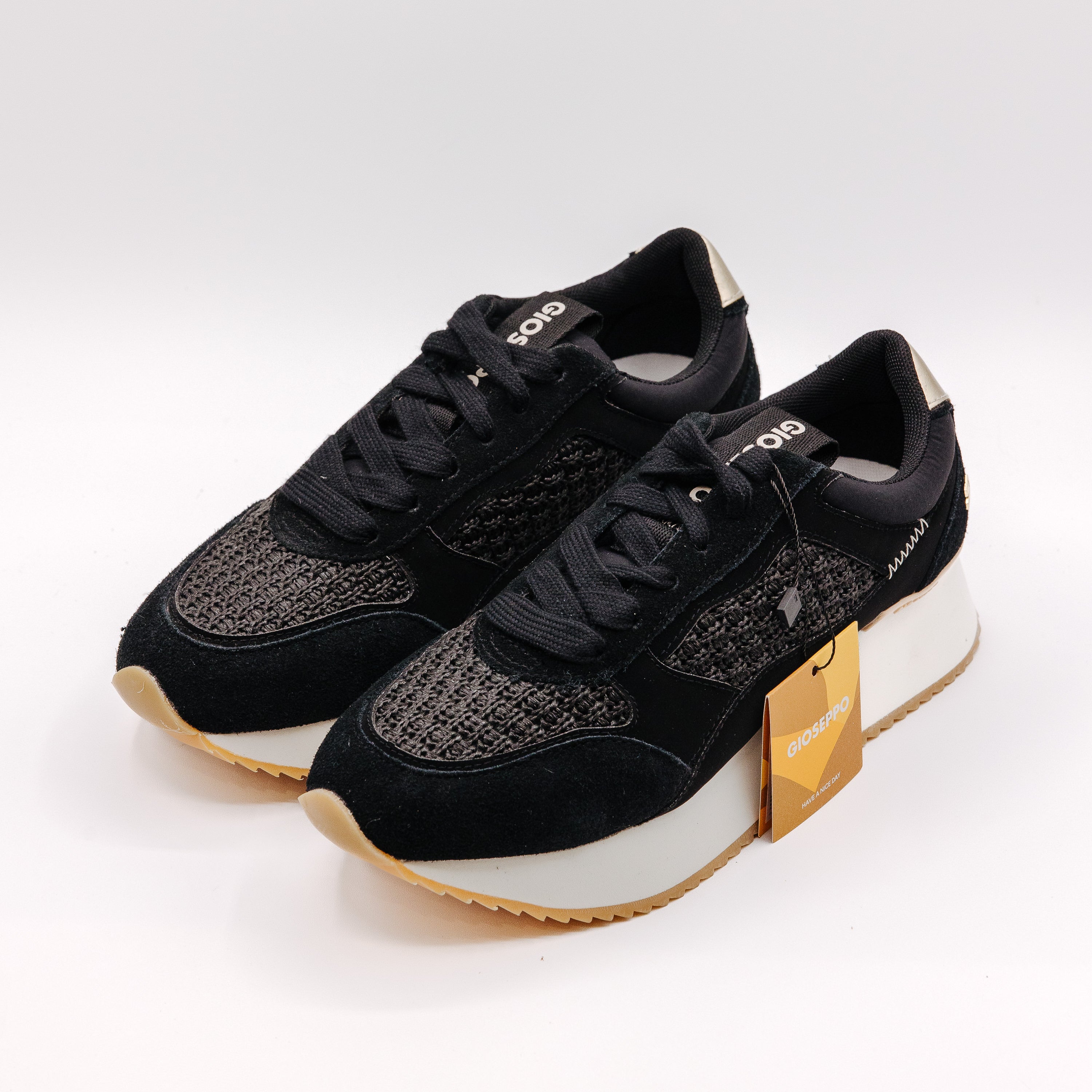 Plitke ženske patike na pertlanje u crnoj boji sa pletenim detaljima i blago izdignutim đonom bele boje brenda Gioseppo.