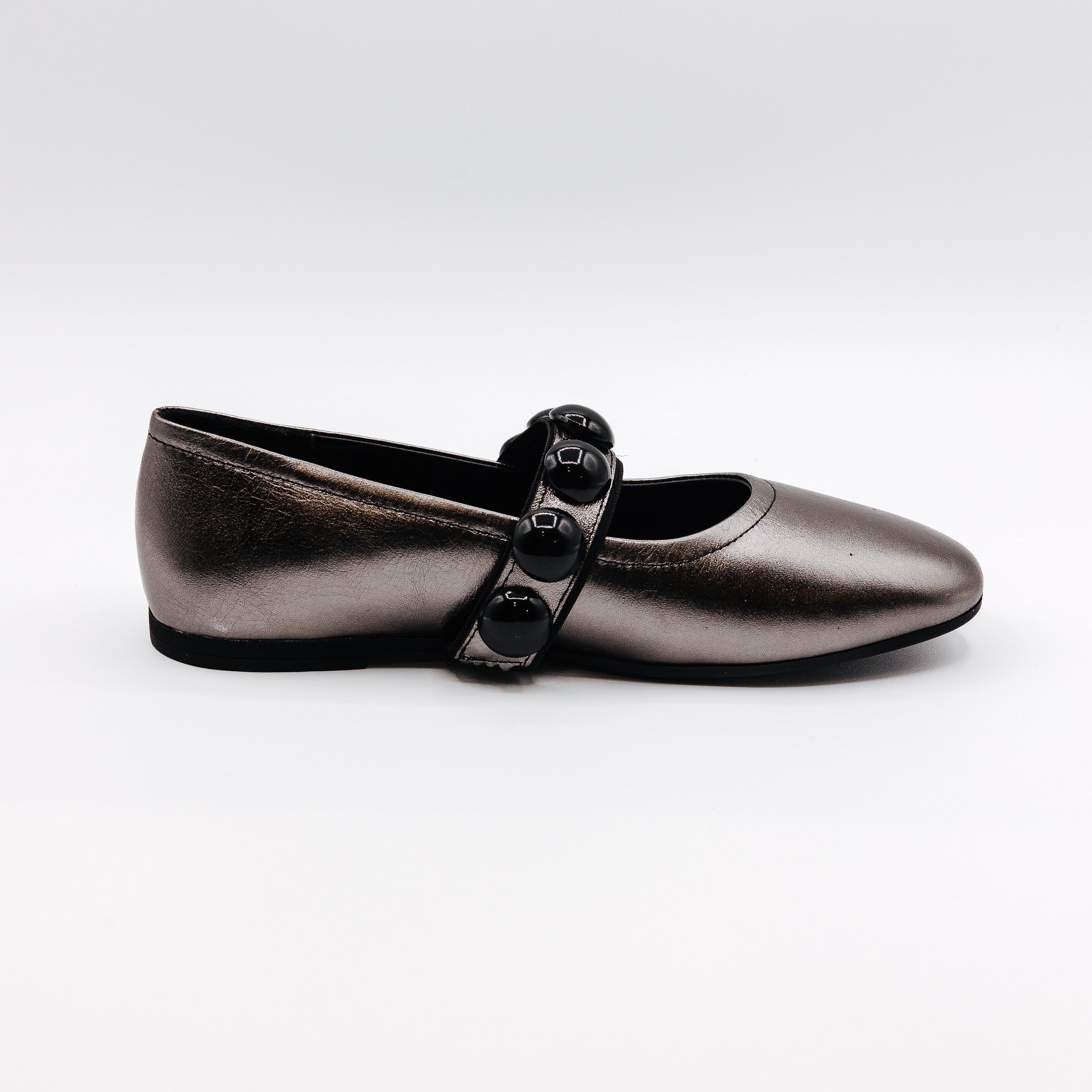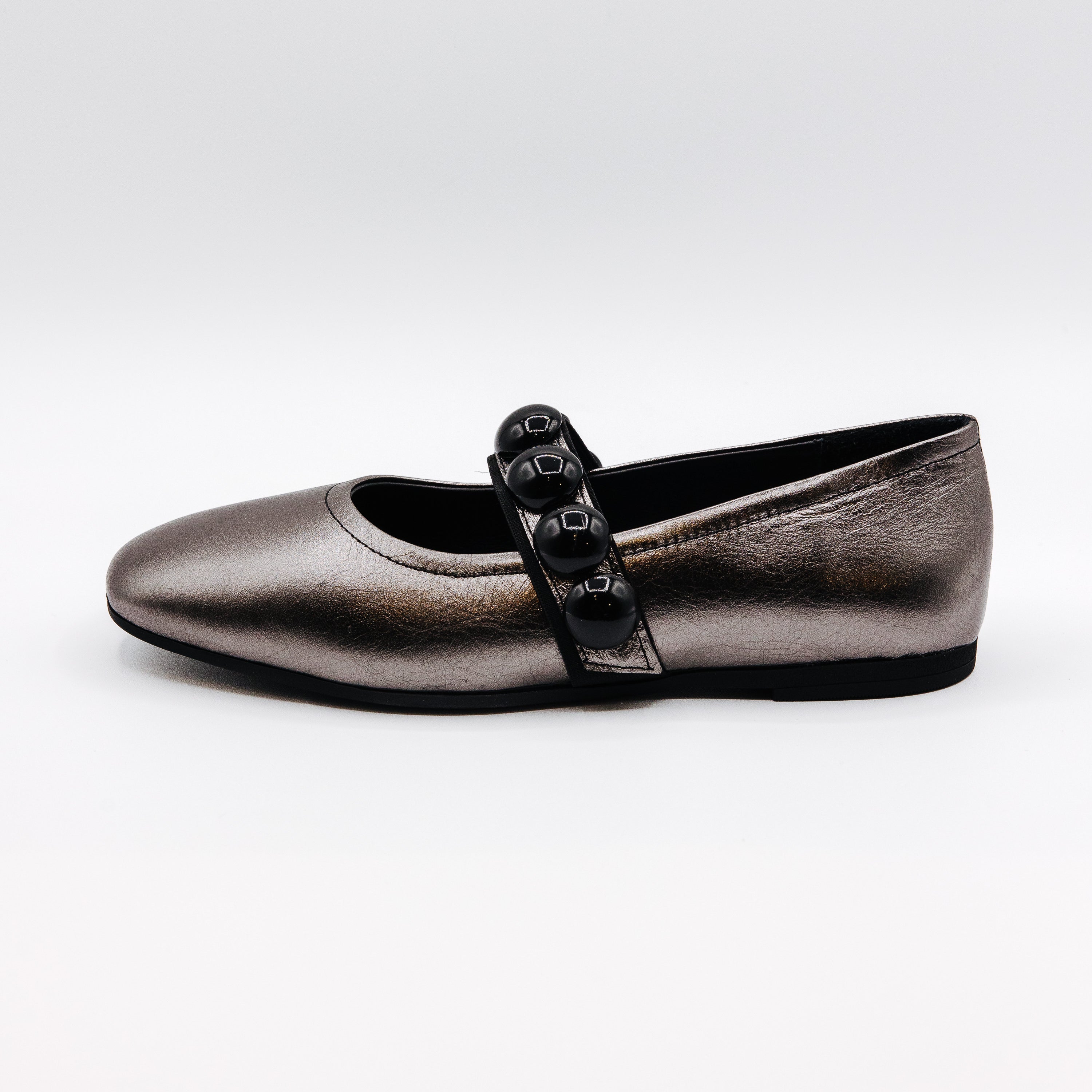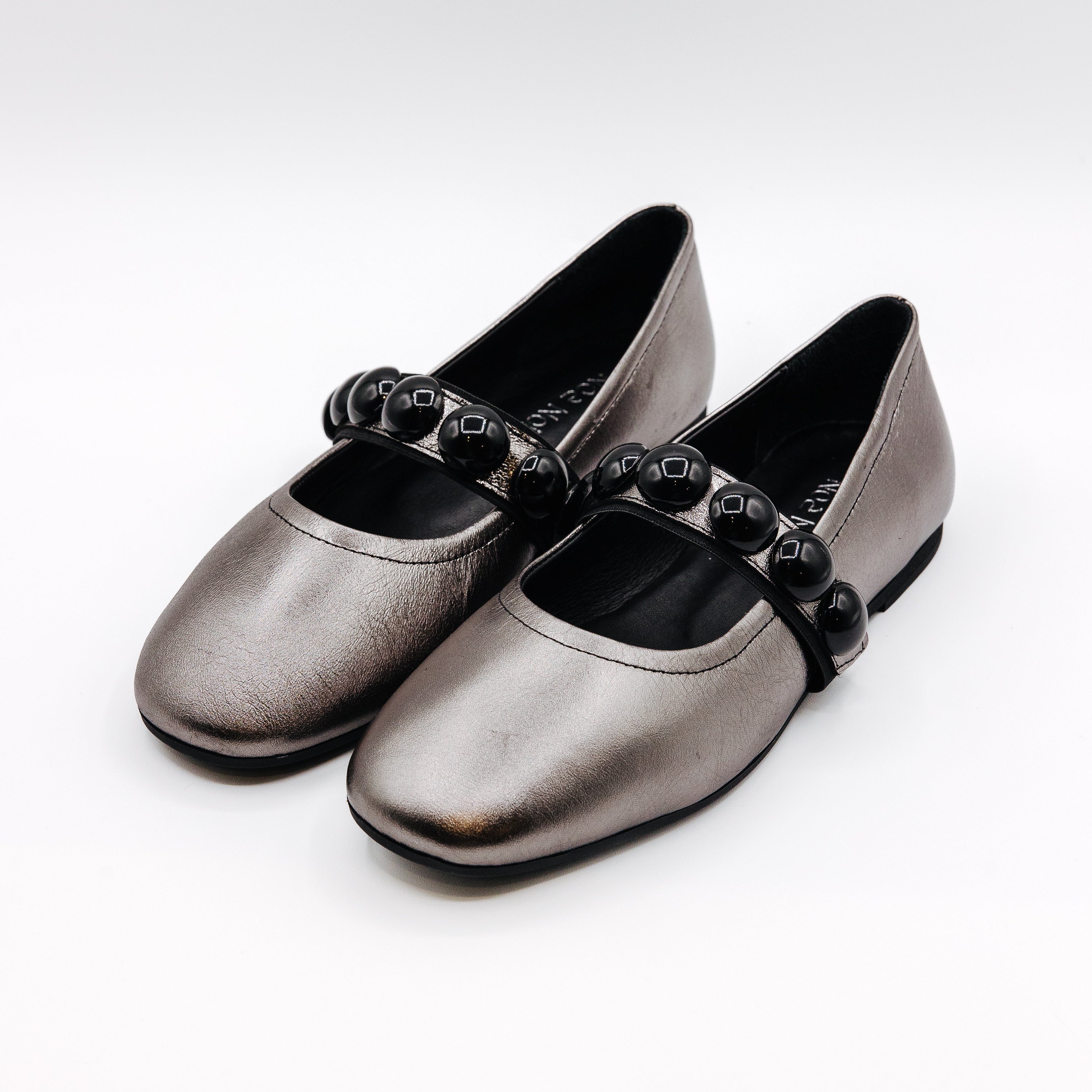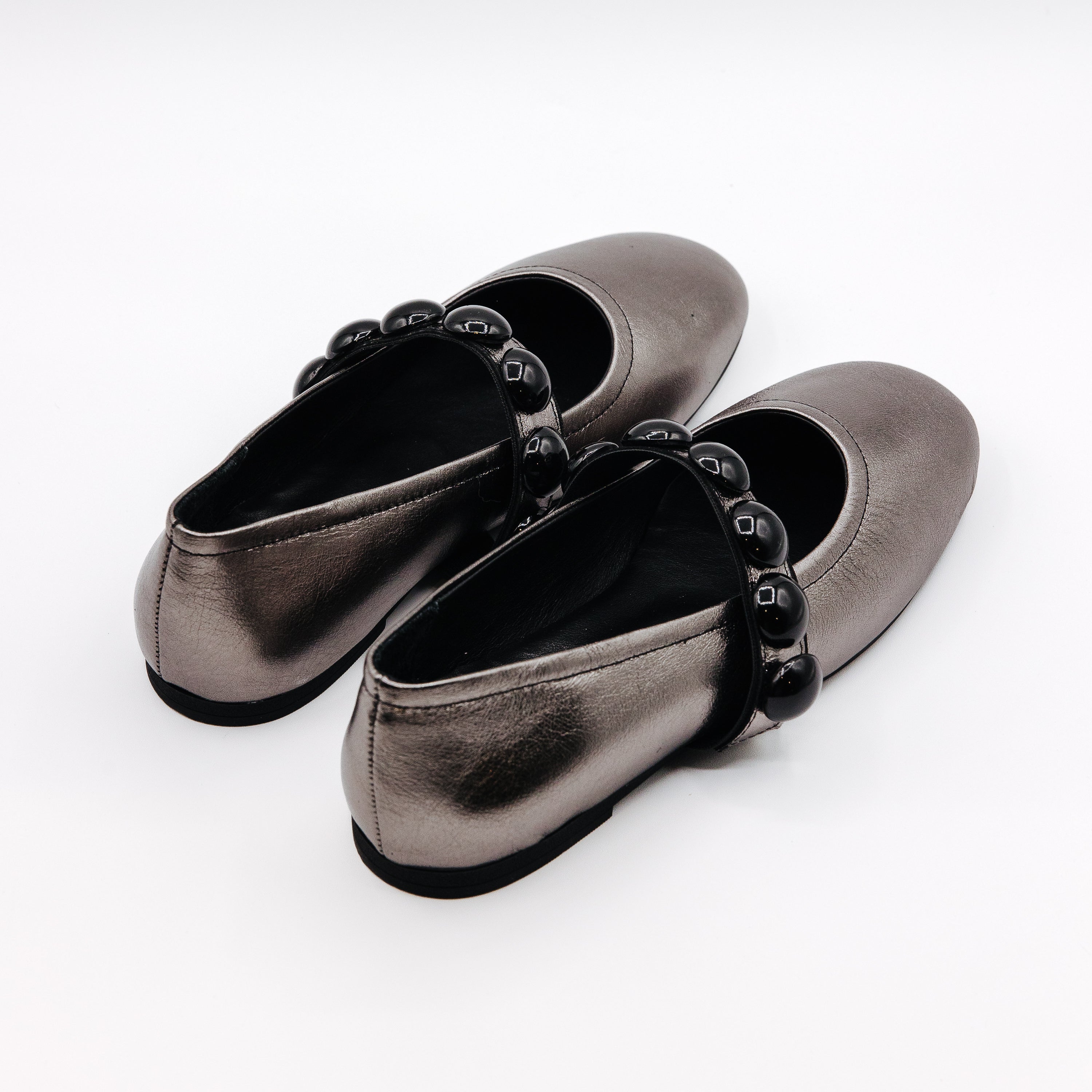 Kožne ženske baletnake u metalik antracit boji sa kaišem i crnim ukrasnim detaljima brenda Noa Noir.